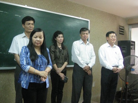 HT. Tiến sỹ Thích Trí Quảng, Hiệu trưởng Học viện Phật giáo Việt Nam tại Tp. HCM cùng với các phó Viện trưởng, các trưởng Ban ngành Học viện đã tiếp đoàn.
