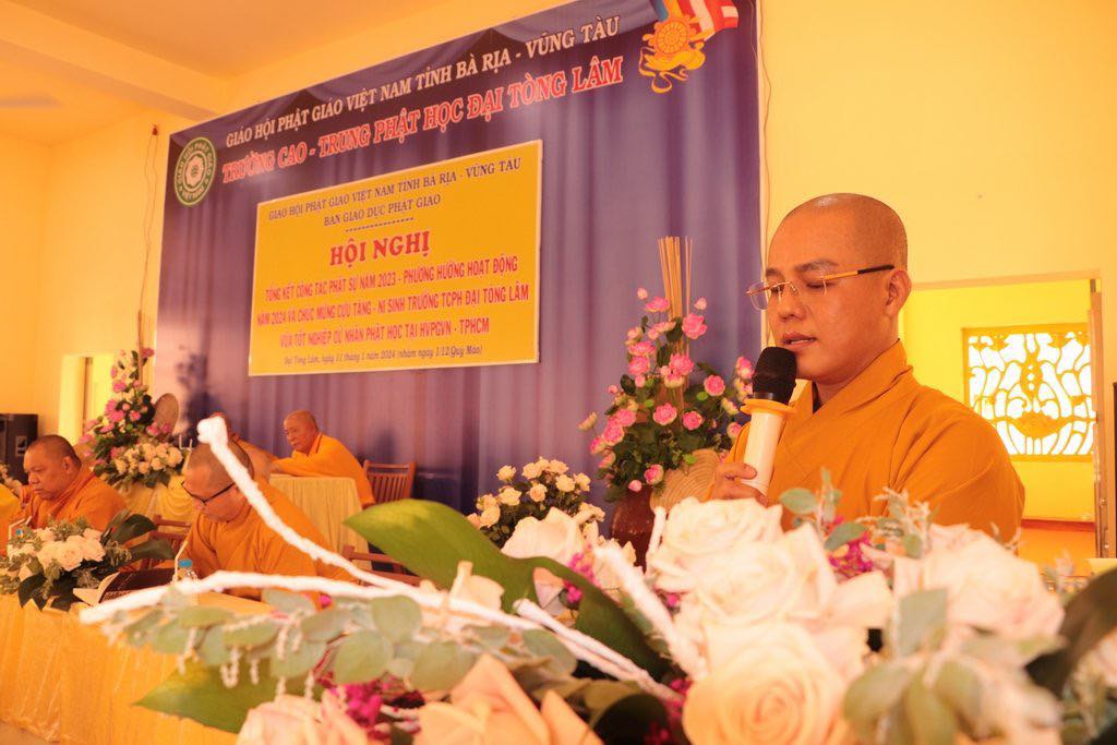 Thay mặt Ban, Đại đức Thích Nguyên Trụ Phó trưởng ban GDPG đã trình bày sơ lược báo cáo tổng kết hoạt động của Ban trong năm Phật sự 2023.