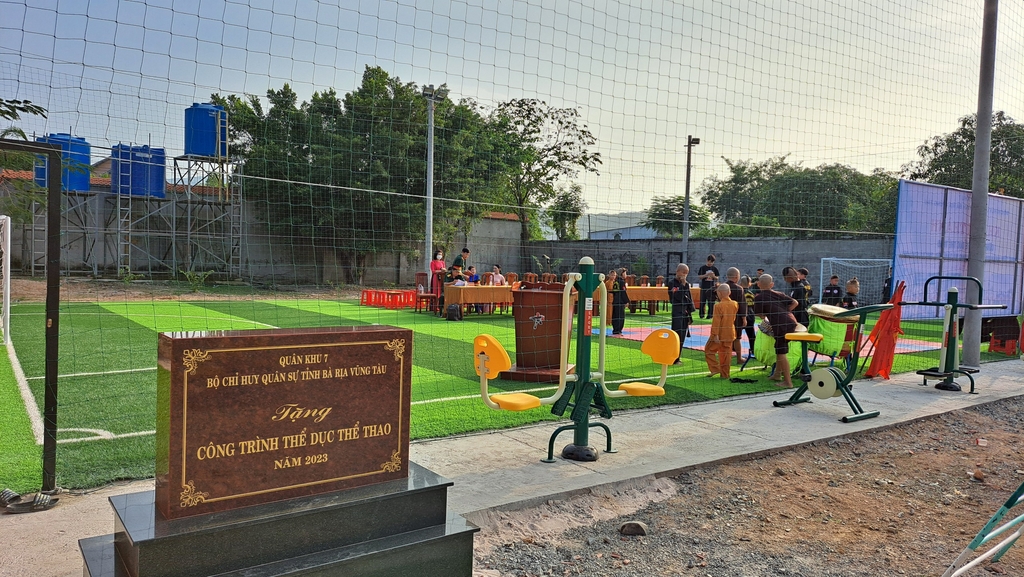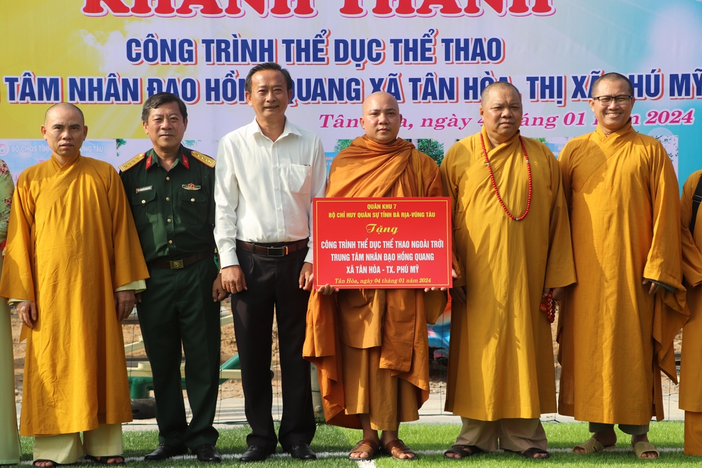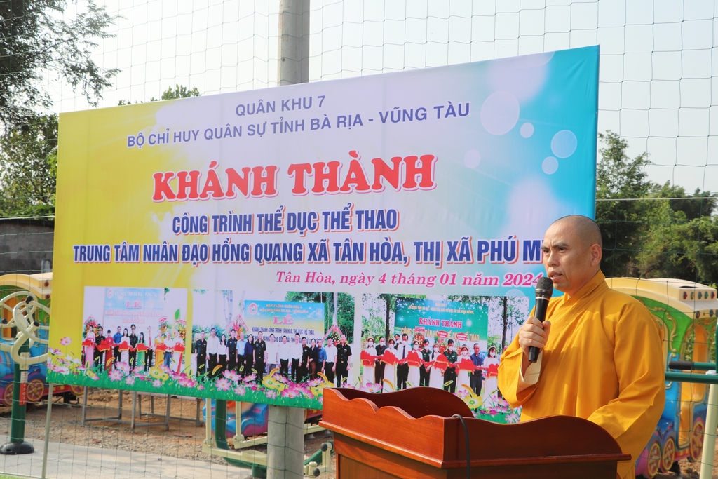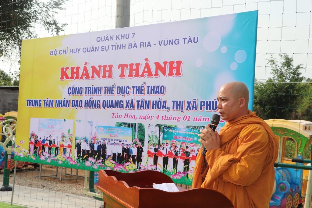 Bộ CHQS tỉnh đã phối hợp Ban Trị sự GHPGVN tỉnh, cấp ủy, chính quyền các địa phương tiến hành khảo sát, lựa chọn công trình và triển khai khởi công xây dựng công trình thể dục thể thao trong cơ sở tôn giáo. Hôm nay, sau thời gian thi công và hoàn thành, Bộ CHQS tỉnh và cấp ủy, chính quyền địa phương thị xã Phú Mỹ, xã Tân Hòa cùng Ban Trị sự GHPGVN tỉnh tổ chức Lễ khánh thành Công trình TDTT ngoài trời tại Trung tâm Nhân đạo Hồng Quang.