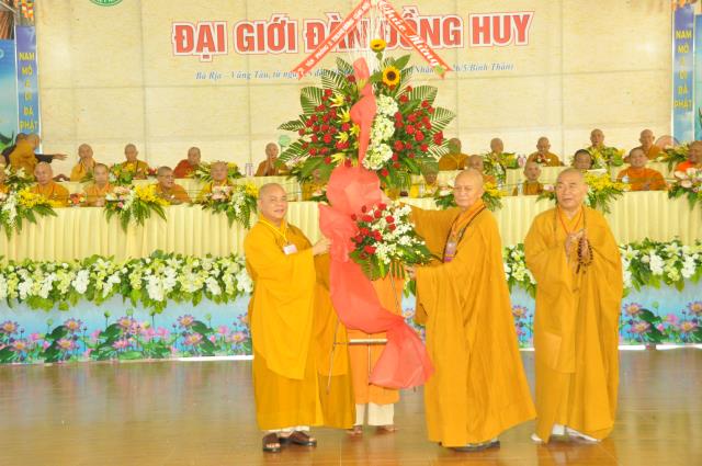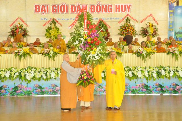 Tiếp theo Chư tôn đức trong BTC đã hoan hỷ đón nhận những lẵng hoa tươi thắm, chúc mừng Đại Giới Đàn Đồng Huy do BTS GHPGVN tỉnh BR-VT tổ chức. Trong đó là những lẵng hoa của: HĐTS TW GHPGVN, do HT. Thích Thiện Pháp trao tặng. Lẵng hoa của VPII TW GHPGVN do HT. Thích Tấn Đạt, UVTT HĐTSTW, Phó Ban kiêm Chánh thư ký Ban Hoằng pháp TW, Phó Chánh văn phòng II TW GHPGVN trao tặng. Lẵng hoa của Phân ban đặt trách Ni giới TW GHPGVN do NT. Tịnh Nguyện Trao tặng. BTC cũng nhận được rất nhiều lẵng hoa tươi thắm từ nhiều BTS các tỉnh, thành gửi đến chúc mừng Đàn Giới Đàn .