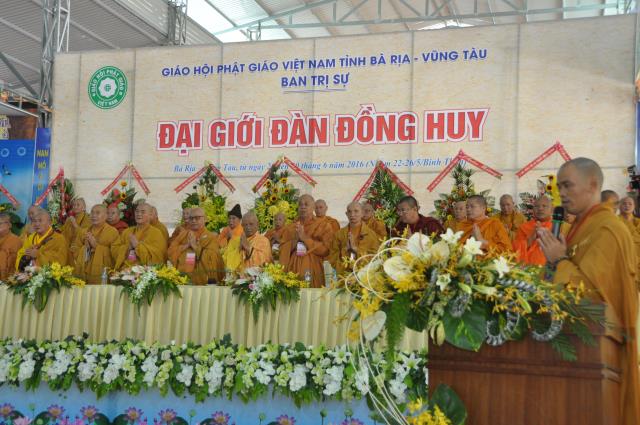 HT. Thích Quảng Hiển, trưởng BTC Đại Giới Đàn nhấn mạnh trong bài phát biểu khai mạc: “Được sự cho phép của Hội đồng Trị sự GHPGVN, và được sự chấp thuận của UBND tỉnh Bà Rịa-Vũng Tàu, hôm nay, BTS GHPGVN tỉnh BR-VT trang nghiêm tổ chức Đại Giới Đàn Đồng Huy tại Thánh địa Đại Tòng Lâm Phật giáo. Tăng Ni, Phật tử tỉnh Bà Rịa-Vũng Tàu rất hân hoan cung nghinh Chư tôn Giáo phẩm Trung ương và các tỉnh thành quang lâm về chứng minh, tham dự. Đây là niềm cảm kích và vinh dự lớn lao của Ban Trị sự Phật giáo tỉnh nhà, đồng thời cũng đánh dấu một chặng đường dài phát triển của Phật giáo Bà Rịa-Vũng Tàu trong lòng Giáo hội suốt hai mươi lăm năm với tám lần tổ chức Đại Giới Đàn mang tính qui mô và tầm cỡ trong khu vực miền Đông Nam Bộ”.