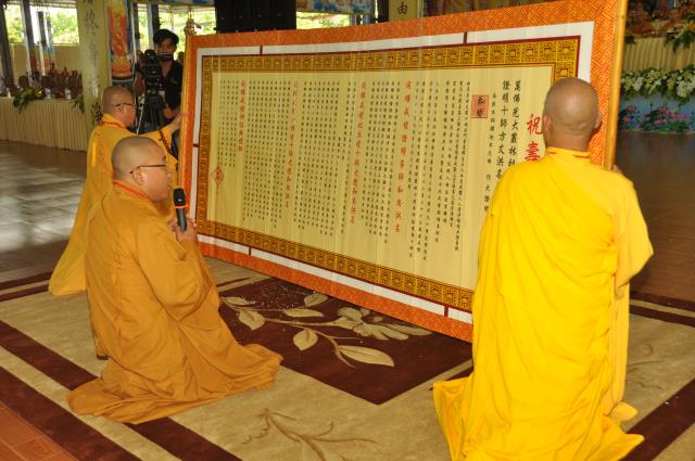 Tại buổi lễ, đại diện chư Tôn đức Tăng, Ni đối trước chư Tôn đức giáo phẩm chứng minh Cung an chức sự bảng Thập sư phương trượng Đại Giới Đàn Đồng Huy. TT. Thích Pháp Huệ, trưởng ban Dẫn thỉnh Đàn giới cung thỉnh Hội đồng Thập sư Tăng.
