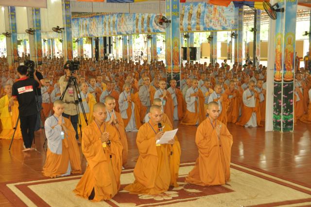 Thể hiện tâm chí thành chí kính và lòng thiết tha cầu thọ giới pháp, đại diện gần 1300 giới tử đối trước Tăng già nhị bộ dâng lời phát nguyện: “Chúng con thật sự đã quá mỏi mệt, nhàm chán với bao tham chấp dối lừa, hận thù tranh đoạt của kiếp người ngắn ngủi. Chính vì thế mà hôm nay, giữa tiếng trống trầm hùng chuông ngân thâm diệu, dù chỉ một lần nhân duyên được cúi mình dập đầu đảnh lễ Chư Tôn đức trong Tuyển Phật Trường của Giới đàn Đồng Huy này, mà trong từng hơi thở của huynh đệ Giới tử chúng con hòa quyện vào từng chồi cây ngọn lá của đất tổ Tòng Lâm. Tận chiều sâu của sơ tâm từ ngày dấn thân vào cửa đạo đến tận hôm nay và chắc hẳn đến ngàn sau, chúng con vẫn thủy chung một tâm nguyện: Thọ trì giới pháp, tục diệm truyền đăng”.