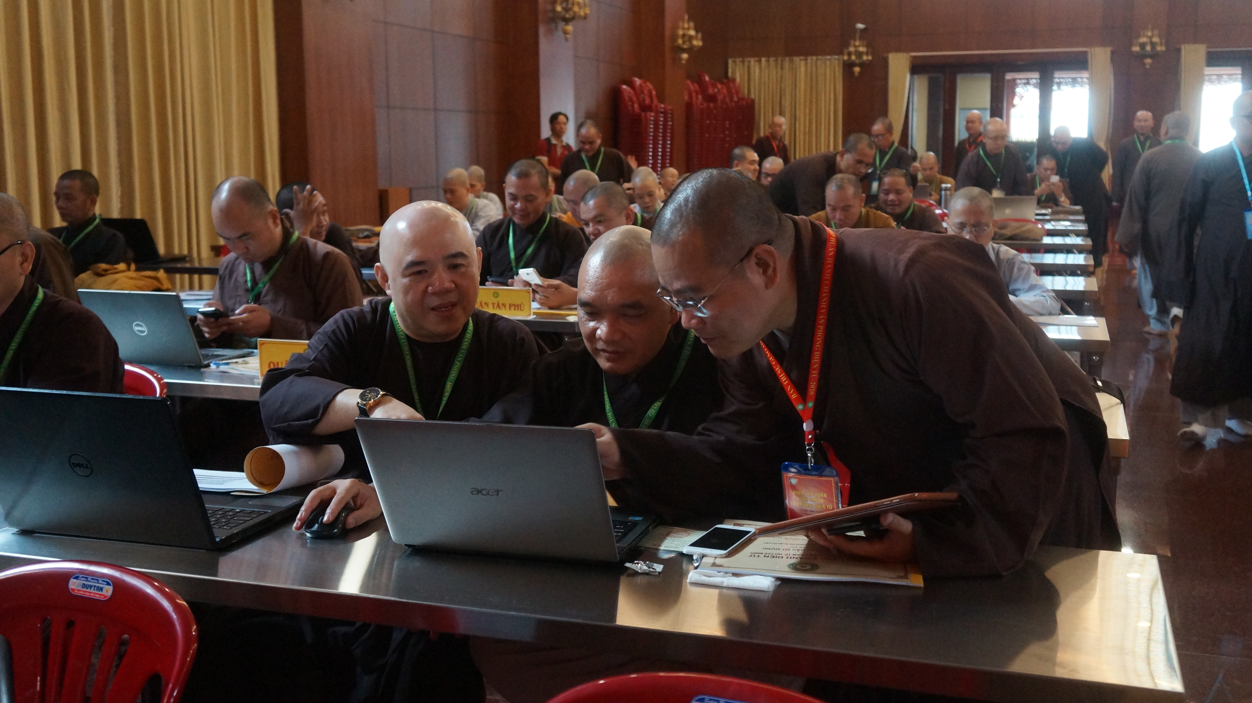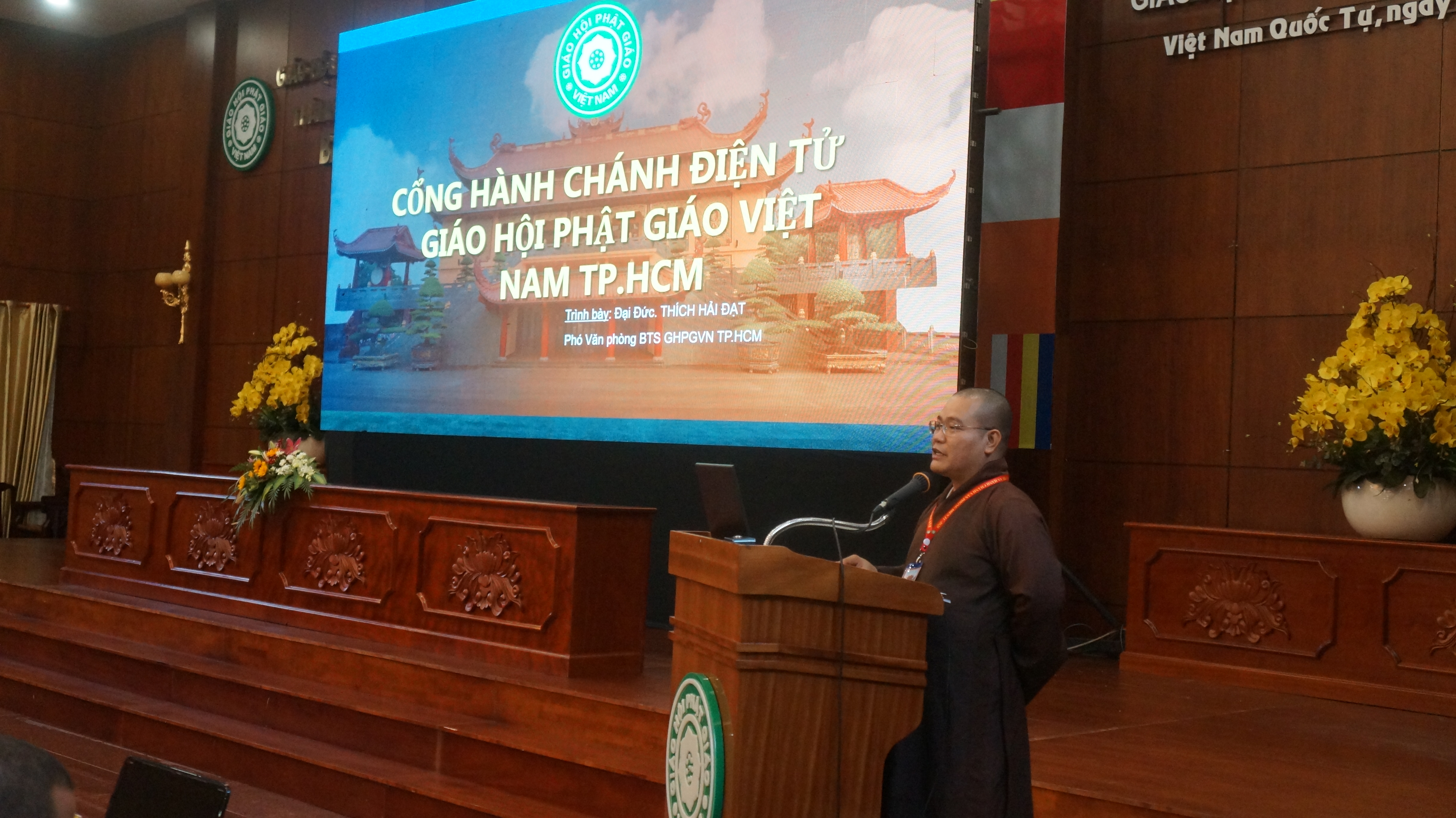 Tiếp đó, ĐĐ. Thích Hải Đạt và ông Huỳnh Tấn Vũ, Giám đốc công ty DYD giới thiệu về trang hành chánh điện tử, các thao tác xử lý văn bản hành chính cũng như giao diện trang web.