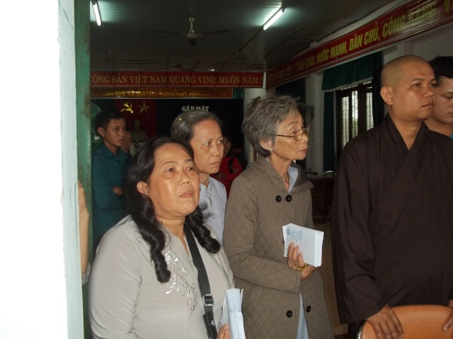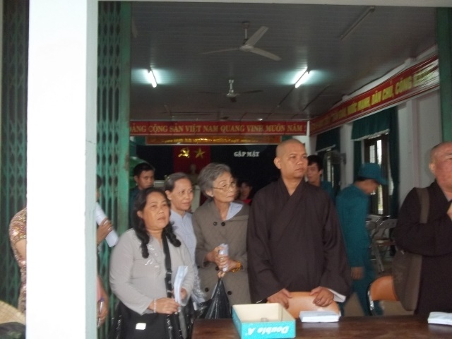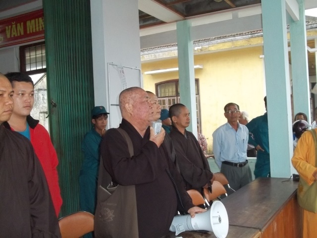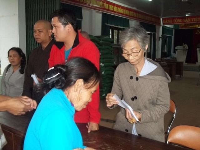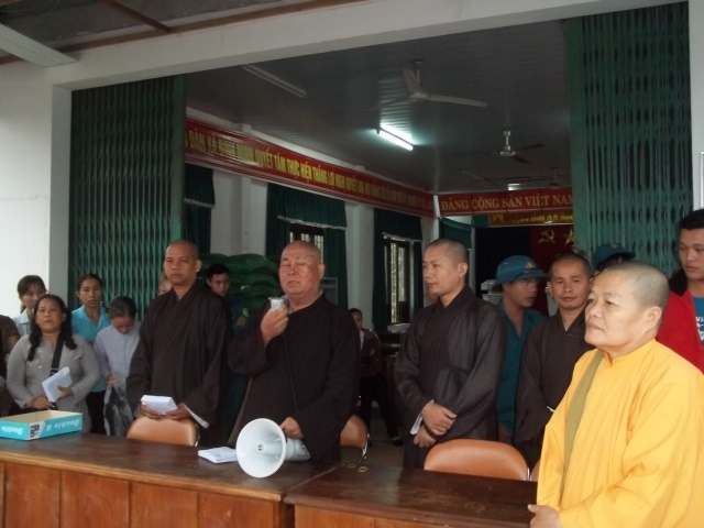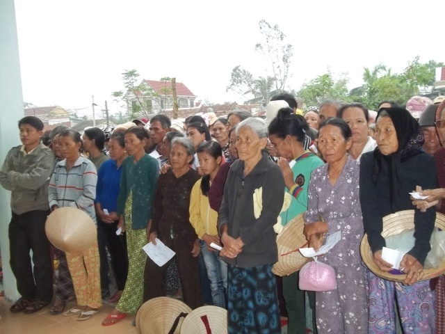 Khởi hành từ 3 giờ sáng ngày 24/10/2013 tại Chùa Vĩnh Tràng Tp. Mỹ Tho, các thành viên trong phái đoàn mọi người rất nóng lòng đến tận các vùng bị thiên tai để chia sẽ khó khăn với bà con. 15 giờ ngày 25/10/2013 đoàn được Ni sư Chúng Liên – Trưởng ban từ thiện xã hội tỉnh Quảng Nam hướng dẫn đến phát quà tại điểm đầu tiên thuộc xã Bình Minh huyện Thăng Bình tỉnh Quảng Nam. Điều khiến cho cả đoàn phải cảm động vì bà con đã đến chờ đợi từ rất sớm, đặc biệt tại địa phương này, bà con đang gặp khó khăn nhưng tấm lòng chân thành của người đất Quảng Nam thật đáng kính. Cô Nguyễn Thị Hòa dân địa phương khi đến nhận quà, chư tôn đức phát nhầm 2 phần cùng lúc (1 triệu đồng), sau khi nhận được quà ra về đến cổng cô Hòa kiểm tra thấy dư một phần nên cô đã vào trong gửi lại Ban tổ chức. Mọi người ai cũng bỡ ngỡ và hoan hỷ trước hành động của cô Nguyễn Thị Hòa tại xã Bình Minh hôm ấy. Dù đang khó khăn gian khổ, nhưng không vì thế mà làm ảnh hưởng đến người khác…đây là một hành động đẹp làm càng ấm lòng hơn người con đất Tiền Giang khi đến thăm đồng bào Miền Trung thân yêu của tổ quốc…