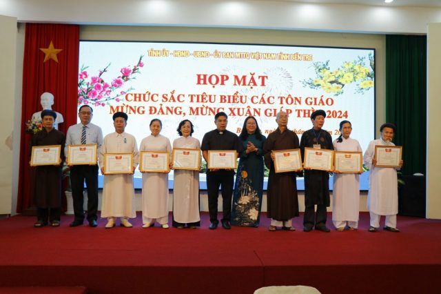 Sáng ngày 26/1/2024, Tỉnh ủy, Hội đồng nhân dân, Ủy ban nhân dân, Ủy ban MTTQ Việt Nam tỉnh Bến Tre tổ chức họp mặt chức sắc tiêu biểu các tôn giáo mừng Đảng, mừng Xuân Giáp Thìn 2024. Tham dự hội nghị có Quyền Bí thư Tỉnh ủy Bến Tre Hồ Thị Hoàng Yến cùng nhiều lãnh đạo sở ngành, tổ chức chính trị xã hội và 150 đại biểu chức sắc tiêu biểu các tôn giáo tham dự.