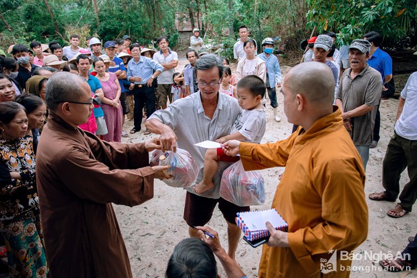 Đại đức Thích Tâm Thành – Trụ trì chùa Cổ Am trao quà cho người dân vùng lũ huyện Hải Lăng (Quảng Trị). Ảnh: Lê KhươngTrước đó, trong 2 ngày 14 và 15/10, đoàn phật sự Đạo Tràng Hương Sen, chùa Đức Hậu (TP Vinh) cũng vượt hàng trăm km để về huyện Phú Vang, tỉnh Thừa Thiên Huế, sau đó di chuyển bằng thuyền, máy cày để đến thăm và trao hàng trăm suất quà là nhu yếu phẩm và tiền mặt cho người dân bị ngập lũ thuộc 2 xã Vinh Thái và Phú Xuân, đồng thời đến thắp hương chia buồn với những gia đình có nạn nhân tử vong trong bão lụt vừa qua.