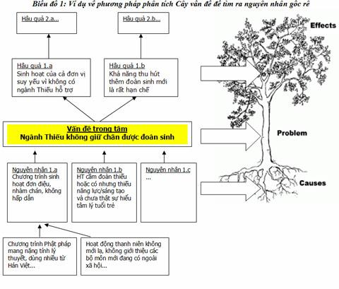 Lấy ví dụ: Một vấn đề lớn mà tổ chức GĐPT đang gặp phải là đa số các đơn vị GĐPT không giữ chân đoàn sinh ngành Thiếu được lâu dài. Các bước tìm hiểu về vấn đề này theo phương pháp Cây Vấn Đề được liệt kê như sau: