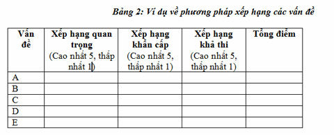 Câu trả lời khôn ngoan chắc chắn là “Không!”. Thay vào đó, chúng ta phải thực hiện phương pháp xếp hạng ưu tiên trong 10 vấn đề để lựa chọn những vấn đề nòng cốt và khả thi nhất. Ví dụ, có thể chọn 5 vấn đề quan trọng nhất/khẩn cấp nhất/khả thi nhất theo bảng hướng dẫn sau.