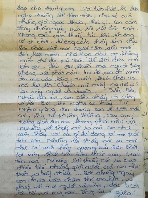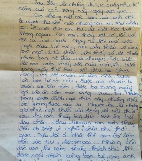 Con cảm thấy những ngày vừa rồi rất đặc biệt, không cảm thấy tủi khi không có ai chơi, không cảm thấy khó chịu khi phải chờ mọi người tắm rửa mới đến lượt mình. Chẳng hạn như con không muốn chờ đợi mà toàn phải để đến đêm mới tắm, gội. Điều đó khiến mọi người trong phòng rất phàn nàn. Lúc đó, con chỉ muốn ôm mẹ vào lòng, muốn khóc thật to và hét lên: “ Chuyện của mấy người à?, sao mấy người vô duyên…Bla… Bla…”. Nhắc đến mẹ con cảm thấy vô cùng có lỗi. Bởi khi nghe quý thầy giảng cho chúng con về tình mẫu tử, phụ tử thiêng liêng, cao quý, tưởng đơn giản mà không phải như vậy.
