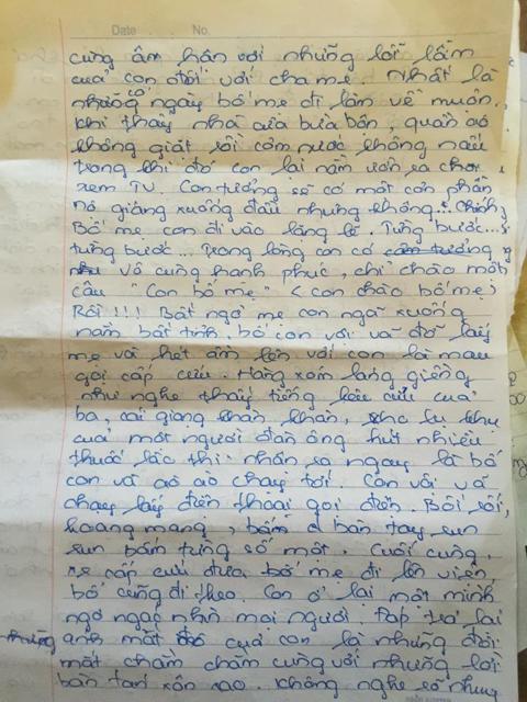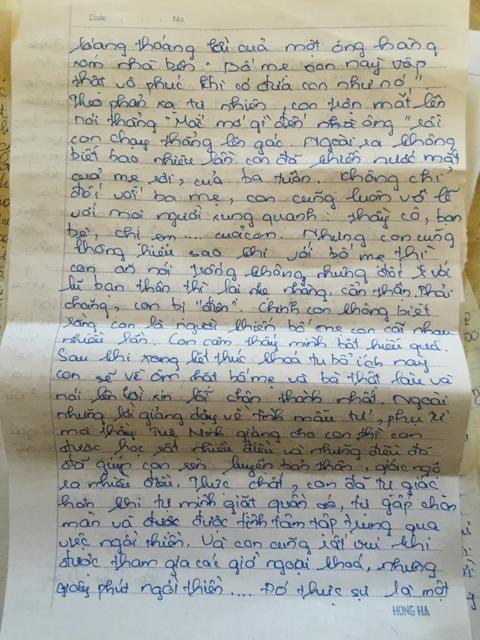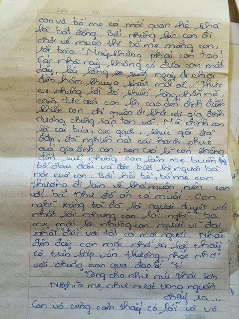 Ngoài ra, không biết bao nhiêu lần con đã khiến nước mắt của mẹ rơi, của ba tuôn. Không chỉ đối với ba mẹ mà con vẫn luôn vô lễ đối với mọi người xung quanh, thầy cô, bạn bè, anh chị em của con…Nhưng con cũng không hiểu sao khi với bố mẹ thì con ăn nói trống không, nhưng đối với lũ bạn than thì lại nhẹ nhàng, cẩn thận. Phải chăng, con bị “ Điên”. Chính con không biết con là người khiến bố mẹ con cãi nhau nhiều lần. Con cảm thấy mình bất hiếu quá.