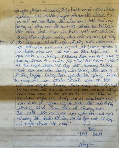 Sau khi kết thúc khóa tu bổ ích này, con sẽ về ôm chặt bố mẹ và bà thật lâu và nói lên lời xin lỗi chân thành nhất. Ngoài những lời giảng dạy về tình mẫu tử, phụ tử mà thầy Tuệ Minh giảng cho con thì con được học rất nhiều điều và những điều đó đã giúp con rèn luyện bản than, giác ngộ ra nhiều điều. Thực chất con đã tự giác hơn khi tự mình giặt quần áo, tự gấp chăn màn và được tĩnh tâm tập trung qua việc ngồi thiền. Và con cũng rất vui khi được tham gia các giờ ngoại khóa, những giây phút ngồi thiền…Đó thực sự là một duyên phận vô cùng đặc biệt mà con được hưởng. Mà chính duyên phận đó được tạo ra bởi bà con đăng ký cho con, bởi bố mẹ đồng ý cho con đi tu một khóa tu bổ ích đến như thế.