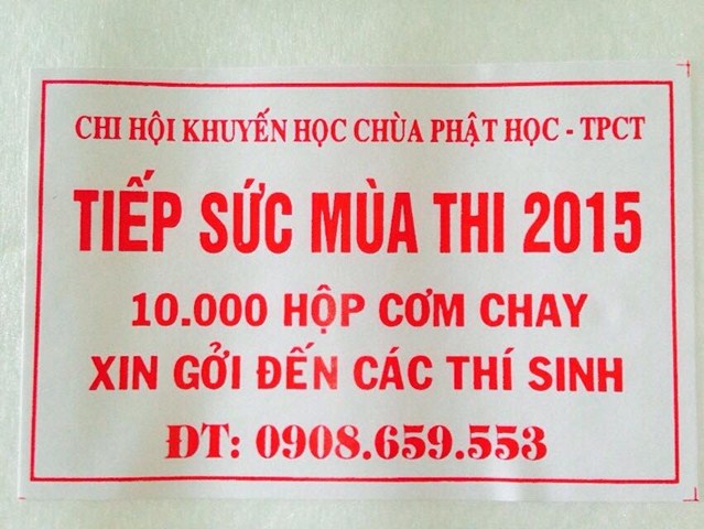 Năm nay, Bộ giáo dục có đổi mới là sẽ lấy điểm của kỳ thi tốt nghiệp để xét tuyển vào các trường Đại học. Vì vậy, kỳ thi tốt nghiệp PTTH năm nay cũng được coi như kỳ thi đầu vào Đại học. Với số lượng thí sinh đổ về Cần Thơ rất đông nên dự kiến năm nay chùa Phật Học, Tp. Cần Thơ sẽ phát khoảng 10 ngàn phần cơm chay miễn phí cho các thí sinh.
