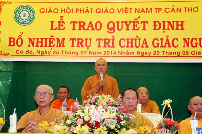 Hòa Thượng Thích Giác Hoa ban đạo từ cho buổi lễ. Hòa Thượng cảm ơn sự quan tâm giúp đỡ của các cấp lãnh đạo chính quyền địa phương đã quan tâm và tạo điều kiện để các thủ tục về việc bổ nhiệm trụ trì diễn ra thuận lợi. Tin tưởng với truyền thống tốt đẹp sẽ luôn quan tâm, giúp đỡ cho Đức đức tân trụ trì hoàn thành tốt trách nhiệm mà Giáo hội thành phố và huyện nhà giao phó. Hòa thượng cũng sách tấn thầy trụ trì phải biết dung hòa mọi người, phải luôn kham nhẫn trước mọi nghịch cảnh và dấn thân phụng sự đạo pháp cũng như hướng dẫn phật tử địa phương sinh hoạt và tu tập theo đúng Hiến chương của Giáo hội cũng như pháp luật của Nhà nước.