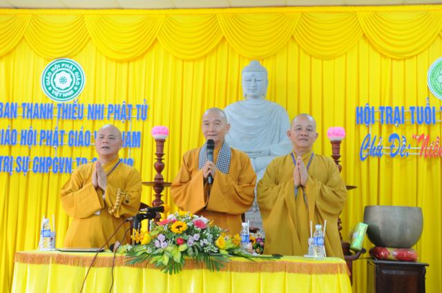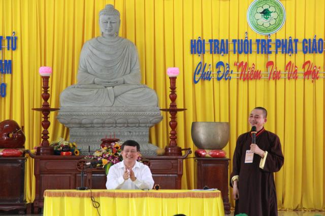 Sau buổi nói chuyện của ông Bùi Hữu Dược, các bạn trẻ được cung đón bước chân của chư tôn đức trong ban chứng minh Hội trại đó là: HT. Thích Thanh Hùng, Ủy viên HĐTS, phó Trưởng ban thường Trực BHDPT Trung ương kiêm Trưởng Phân ban Cư sĩ Phật tử, HT. Thích Tấn Đạt, Ủy viên HĐTS, phó trưởng ban thường trực Ban Hoằng pháp trung ương, HT. Thích Minh Thiện, Ủy viên HĐTS, phó thường trực Ban Hoằng pháp trung ương, trưởng BTSGHPG tỉnh Long An. Quý Ngài đã quang lâm chứng minh và giao lưu với các bạn trại sinh, còn dành nhiều tình cảm, lời sách tấn để các em vững bước đi trên con đường cao đẹp của mình.
