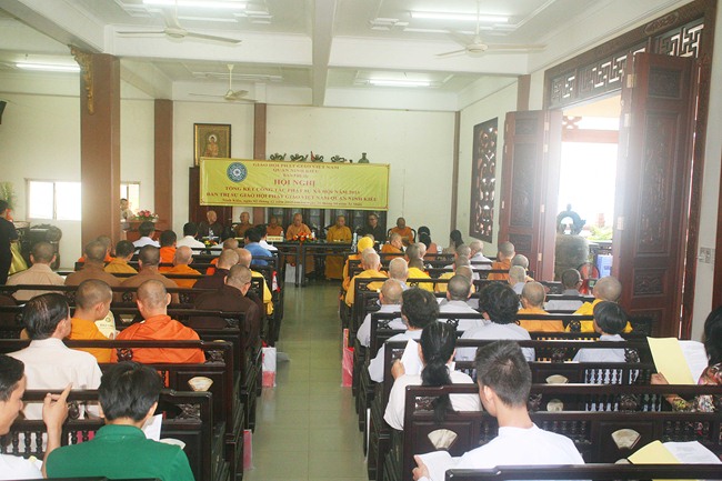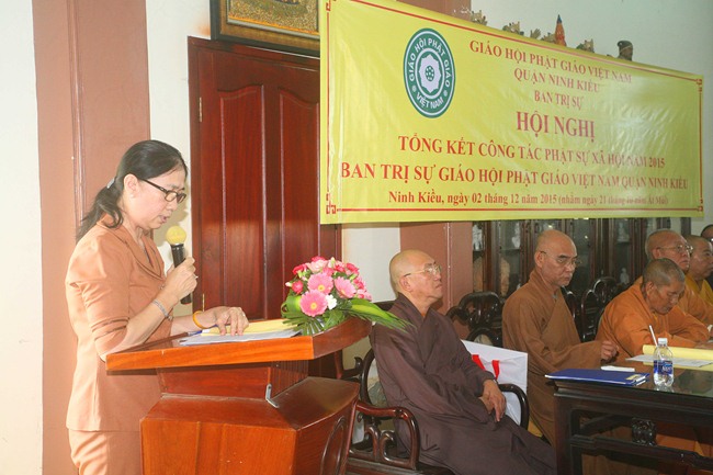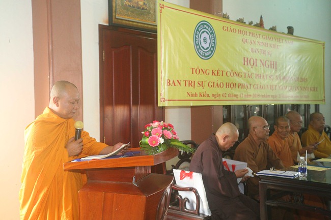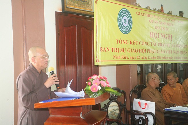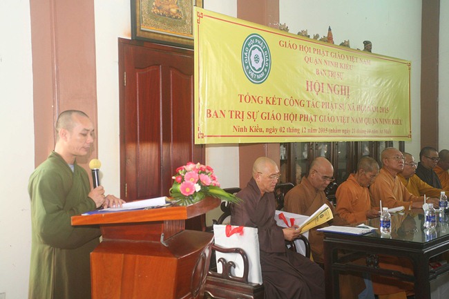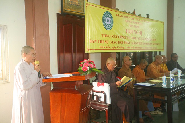 Mở đầu buổi tổng kết, ĐĐ Thích Pháp Tịnh – Ủy viên Ban Trị sự GHPGVN Q.Ninh Kiều thông qua báo cáo công tác Phật sự xã hội (PSXH) năm 2015. Theo đó, toàn địa bàn quận Ninh Kiều có 60 cơ sở tự viện, tổng số Tăng Ni là 124 vị trong đó Hòa thượng 03 vị, Thượng tọa 02 vị, Ni trưởng 02 vị, Ni sư 09 vị. Hưởng ứng lời kiêu gọi của Báo Giác Ngộ Tp.HCM đã giúp đỡ đưa đón các em thí sinh ở các vùng sâu, xa có nơi ăn, nghỉ thuận tiện đến Tp.Cần Thơ trong thời gian thi đại học năm 2015 tổng giá trị tính thành tiền là 198.000.000đ.