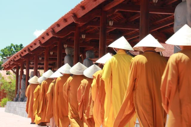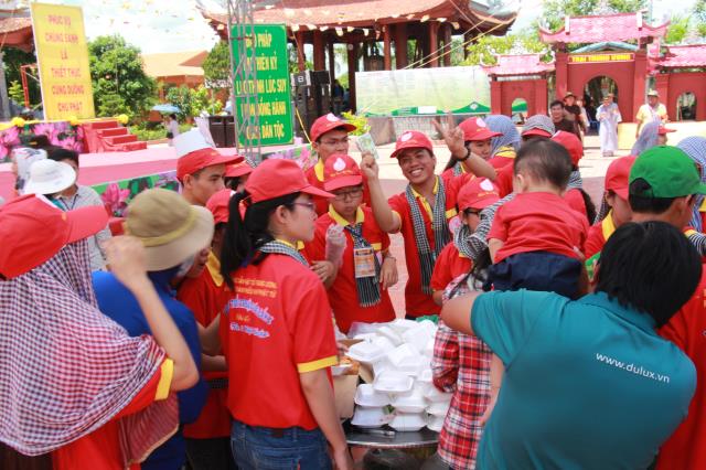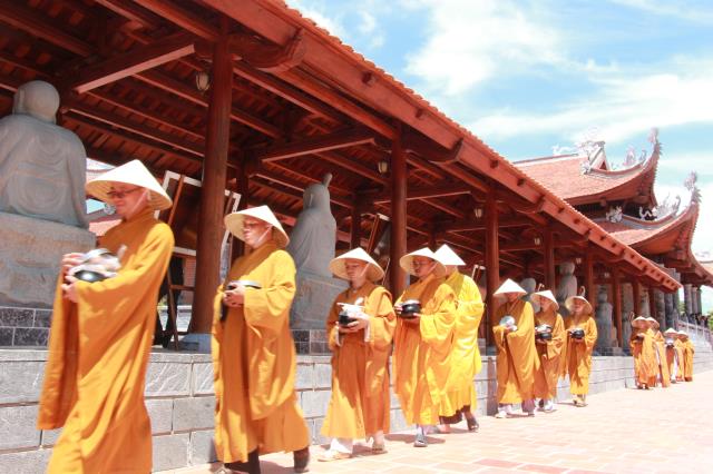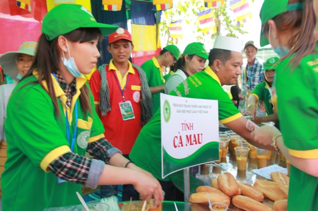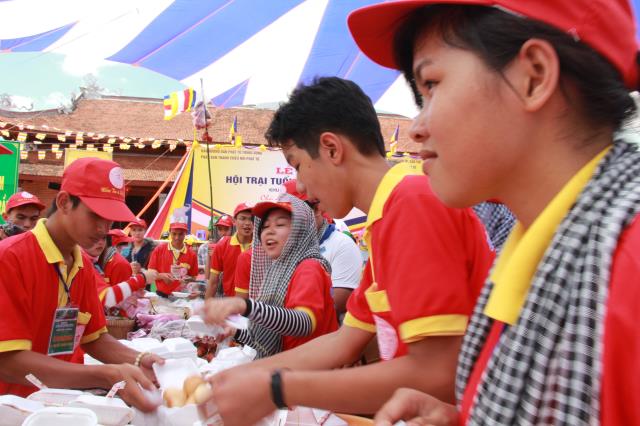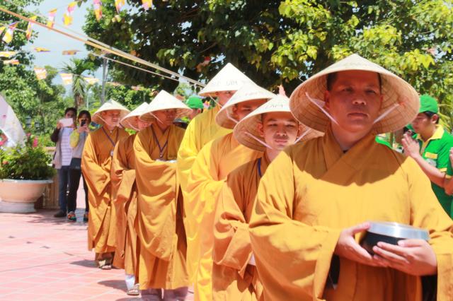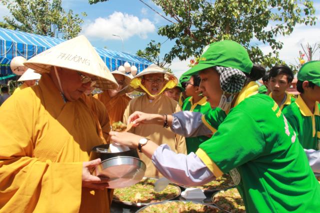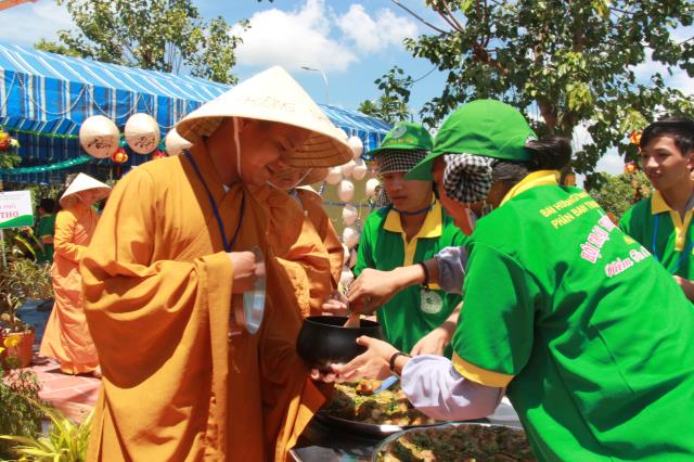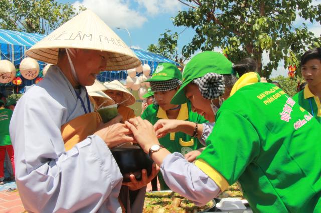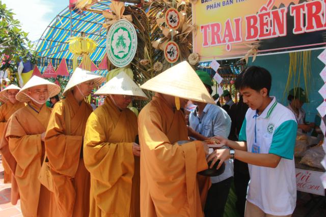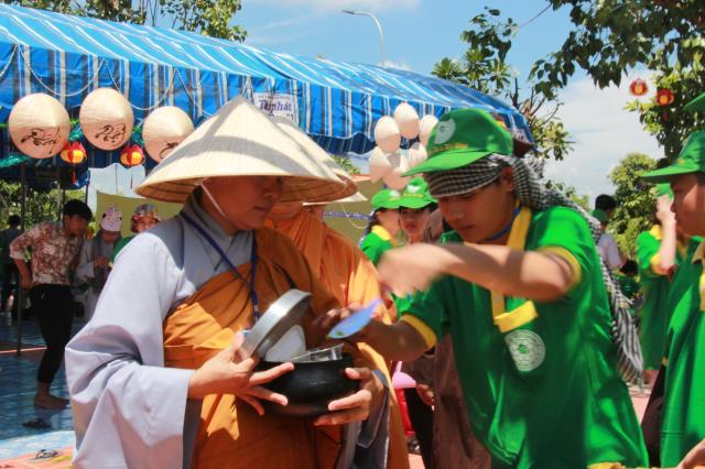 Trước khi phiên chợ được bắt đầu, chư tôn đức tăng ni trong chiếc huỳnh y rực rở, với tư thế khoan thai, tay ôm bình bát, từng bước nhẹ nhàng đi qua các gian hàng của từng trại. Các bạn trẻ thành tâm, tay chắp hình búp sen, một lòng thành kính dâng lên những món ăn, nước uống, vật phẩm cúng dường. Hình ảnh này chúng ta thường bắt gặp ở thuở xa xưa, khi đức Phật còn tại Thế. Mỗi ngày, Ngài và tăng đoàn thường vào các thành ấp, xóm làng khất thực, để gần gủi với chúng sanh, giúp họ tháo gỡ những nối khổ niềm đau trong cuộc đời.