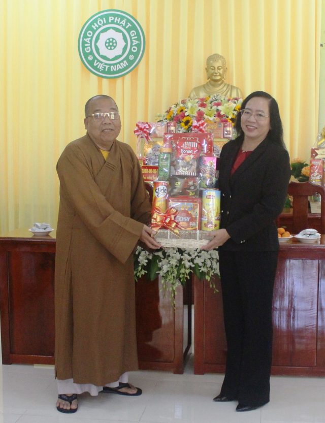 Bà Nguyễn Thúy Hằng, Phó Chủ tịch Ủy ban MTTQVN thành phố tặng quà Tết các chức sắc tại Ban Trị sự Giáo hội Phật giáo Việt Nam thành phố. (Ảnh Tâm Khoa)