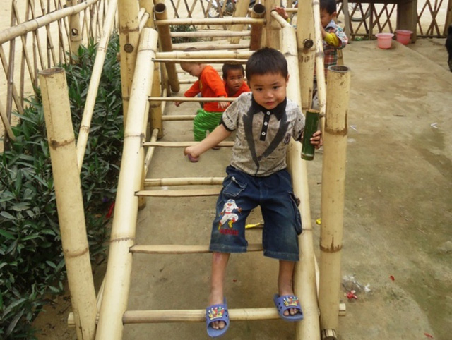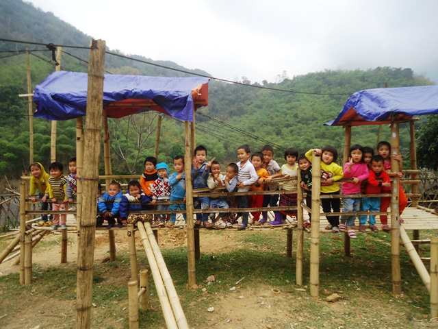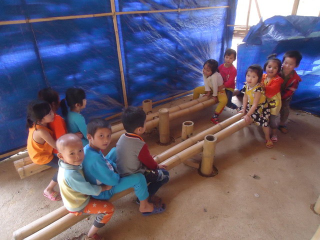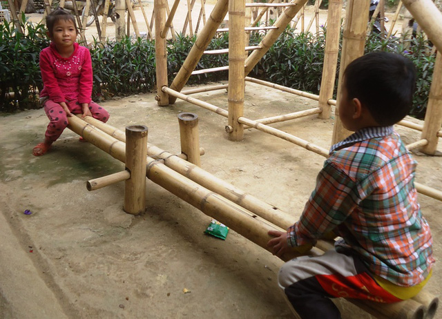 Những dụng cụ trò chơi của các em học sinh được làm từ tre rừng