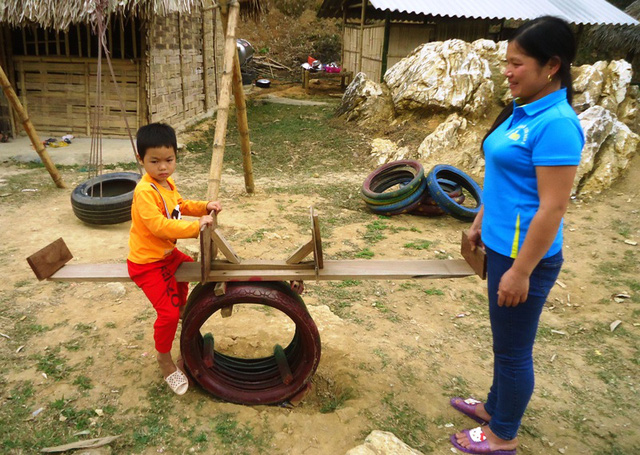 Lốp xe ô tô hư hỏng được các cô giáo chế tạo thành đu quay cho trẻ