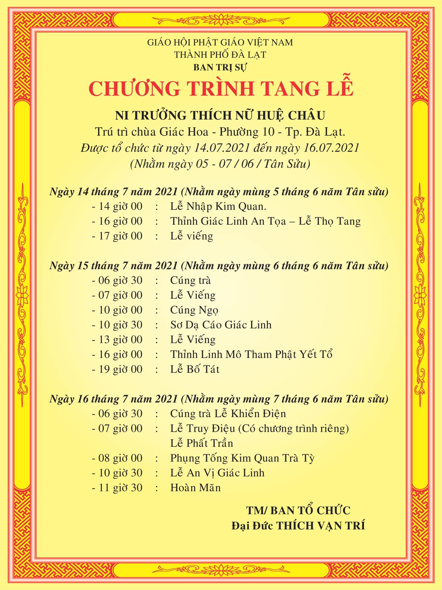 Lễ viếng bắt đầu vào lúc: 17giờ00, ngày 14/07/2021 (nhằm ngày 05 tháng 06 năm Tân Sửu).