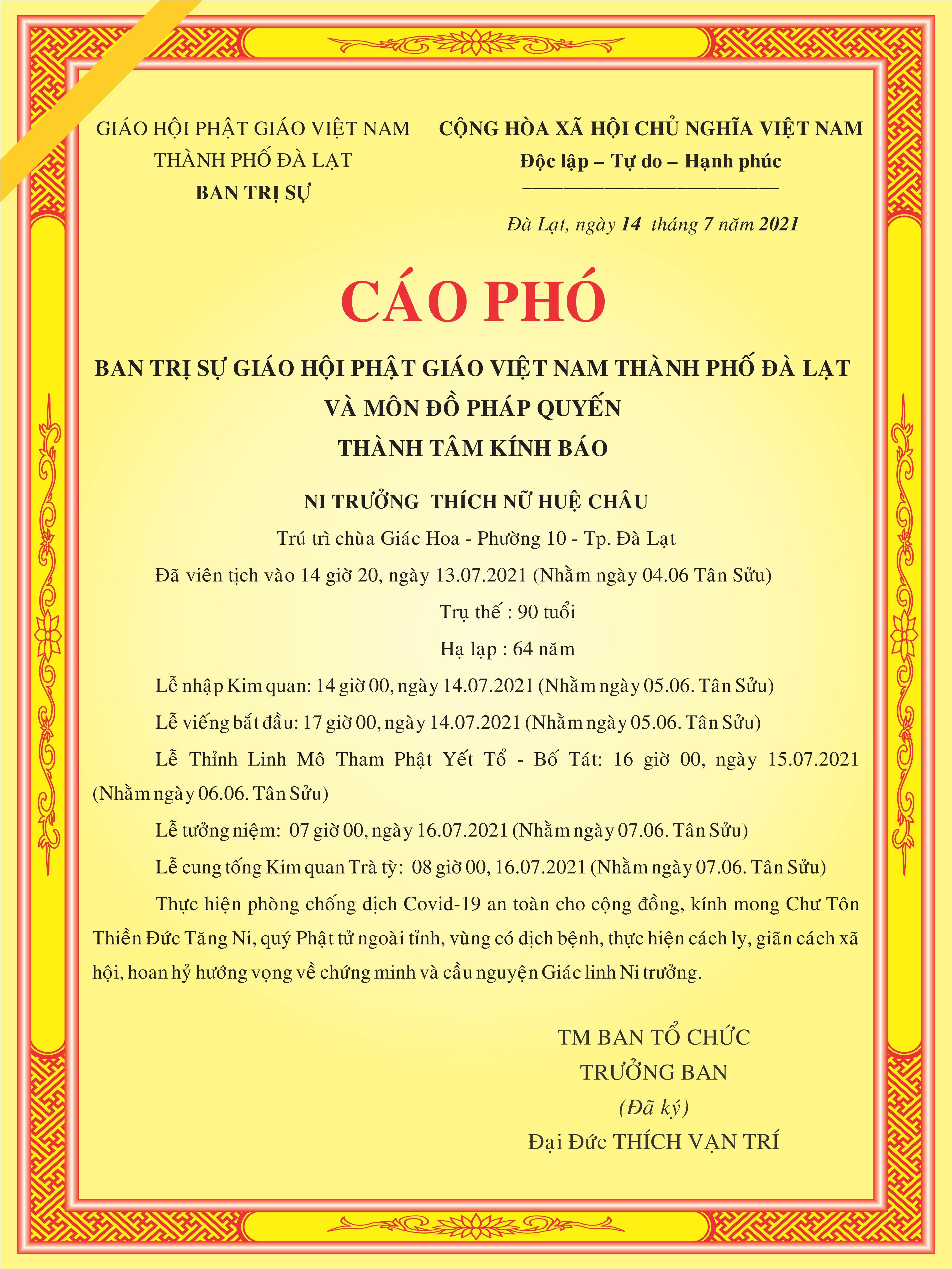 Ban trị sự GHPGVN thành phố Đà Lạt, tỉnh Lâm Đồng và môn đồ, pháp quyến, thân quyến, thành tâm kính báo: