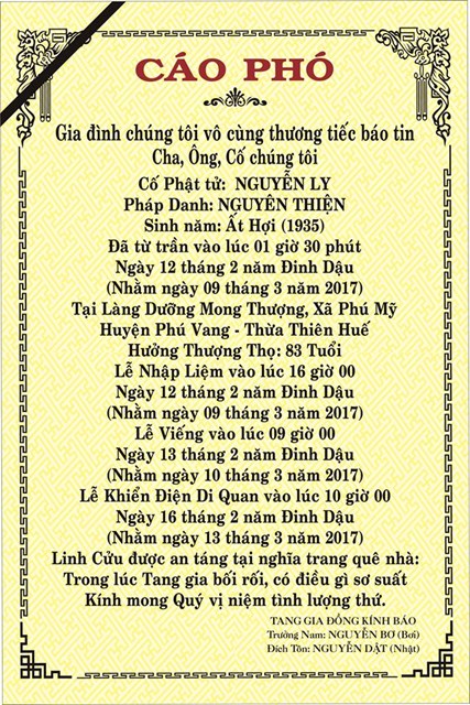 Vào hồi 01h30’ ngày 09 tháng 03 năm 2017 (Tức ngày 12/02 năm Đinh Dậu ), tại Làng Dưỡng Mong Thượng, xã Phú Mỹ, huyện Phú Vang, tỉnh Thừa Thiên Huế.