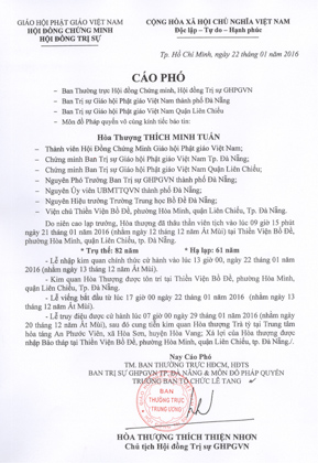 – Lễ truy điệu được cử hành lúc 07 giờ 00 ngày 29 tháng 01 năm 2016 (nhằm ngày 20 tháng 12 năm Ất Mùi), sau đó cung tiễn kim quan Hòa thượng Trà tỳ tại Trung tâm hỏa táng An Phước Viên, xã Hòa Sơn, huyện Hòa Vang; Xá lợi của Hòa thượng được nhập Bảo tháp tại Thiền Viện Bồ Đề, phường Hòa Minh, quận Liên Chiểu, tp. Đà Nẵng./.