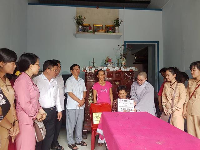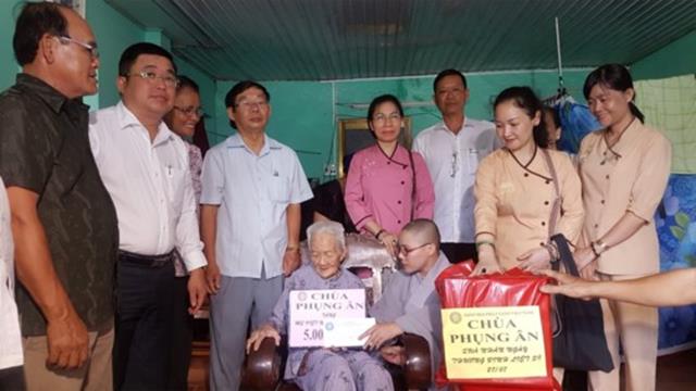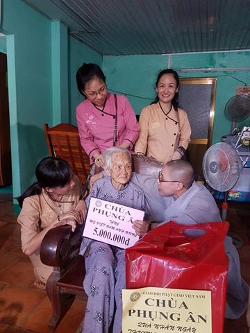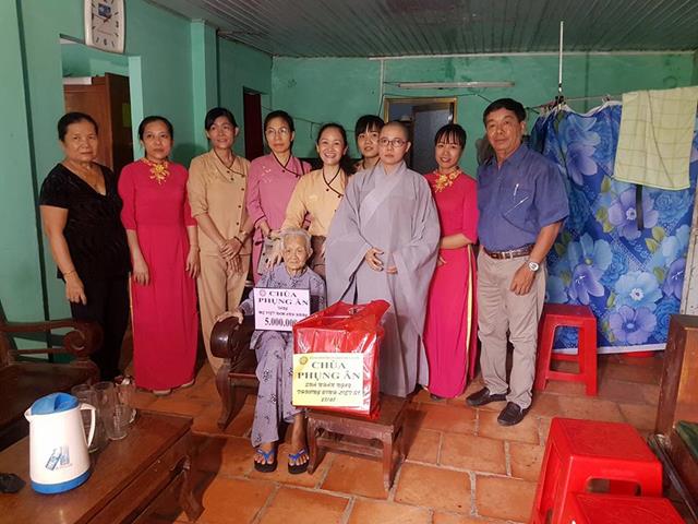 Đại diện Hội Hữu nghị Việt Nam – Campuchia TPHCM và tăng ni, phật tử chùa Phụng Ân trao tiền phụng dưỡng Mẹ Việt Nam Anh hùng Ngô Thị B, ngụ ấp 3A, xã Tân Thạnh Đông, huyện Củ Chi