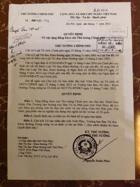Trước tiên, xin nói qua về lý lịch của ĐĐ.Thích Giác Minh. Đại đức từng giữ cương vị Phó Thường trực BTS kiêm Trưởng ban Hoằng pháp, Trưởng ban Thông tin – Truyền thông GHPGVN tỉnh Vĩnh Phúc; Chánh đại diện BTS PG Tp.Vĩnh Yên (từ năm 2003, nay là Trưởng BTS PG Tp.Vĩnh Yên); từng là đại biểu HĐND tỉnh, thành phố và phường Tích Sơn, UV Ủy ban MTTQVN ba cấp…Trong quá trình giữ các chức vụ trên, ĐĐ đã nhiều lần được trao bằng tuyên dương công đức của GHPGVN, bằng khen, giấy khen của các cấp chính quyền và năm 2013 được nhận Bằng khen của Thủ tướng Chính phủ (theo Quyết định số 862/QĐ-TTg ngày 12/07/2012) vì “tích cực tham gia phong trào thi đua yêu nước và xây dựng Giáo hội Phật giáo Việt Nam, góp phần vào sự nghiệp xây dựng chủ nghĩa xã hội và bảo vệ Tổ quốc). Việc ĐĐ nhận muộn là do có một số thế lực ngăn cản.