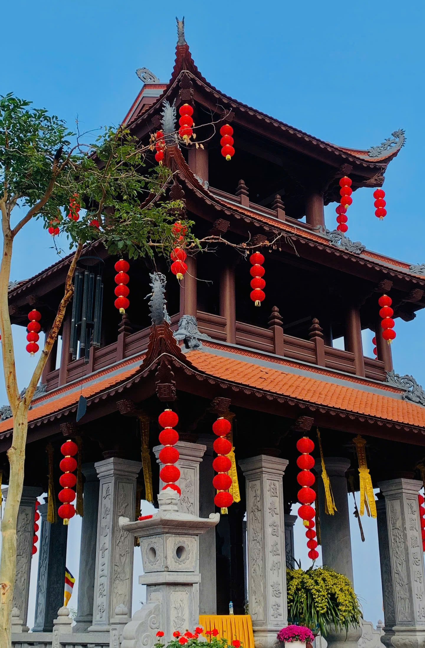 Trong chính điện còn thờ thất Phật Thế Tôn. Trước chính điện là lầu chuông gác trống cao 3 tầng.