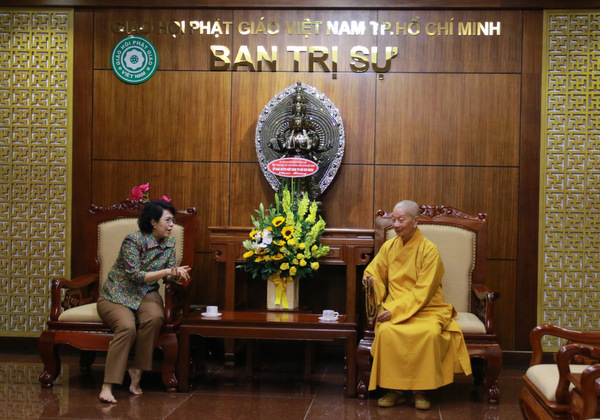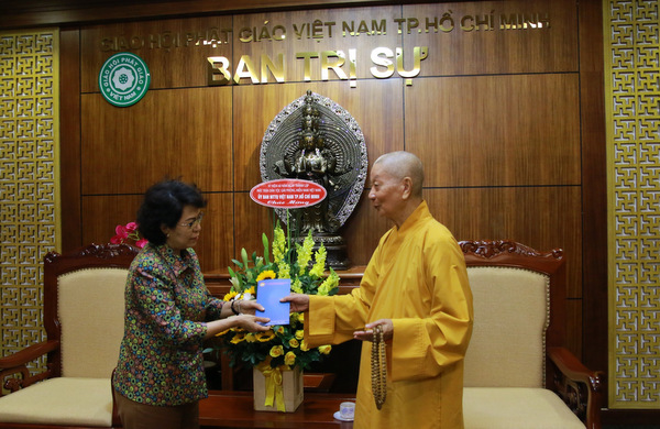 Bà Tô Thị Bích Châu, Chủ tịch Ủy ban MTTQVN TPHCM vấn an sức khỏe và gửi chúc mừng đến Trưởng lão Hòa thượng Thích Trí Quảng, Phó Pháp chủ kiêm Giám luật HĐCM, Trưởng BTS GHPGVN TP.HCM.