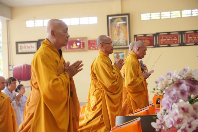 Nghi thức cầu nguyện được thực hiện trang nghiêm tại chánh điện và Tổ đường. Trong buổi lễ, Đại đức Thích Lệ Ngôn – Trưởng phòng Đào tạo Học viện Phật giáo Việt Nam tại TP.HCM, Phó Trưởng ban Trị sự kiêm Trưởng ban Hoằng pháp GHPGVN tỉnh Long An, Trụ trì chùa Ân Thọ đã thành kính cung tuyên tiểu sử của Cố Ni trưởng khai sơn Thích nữ Như Khánh.