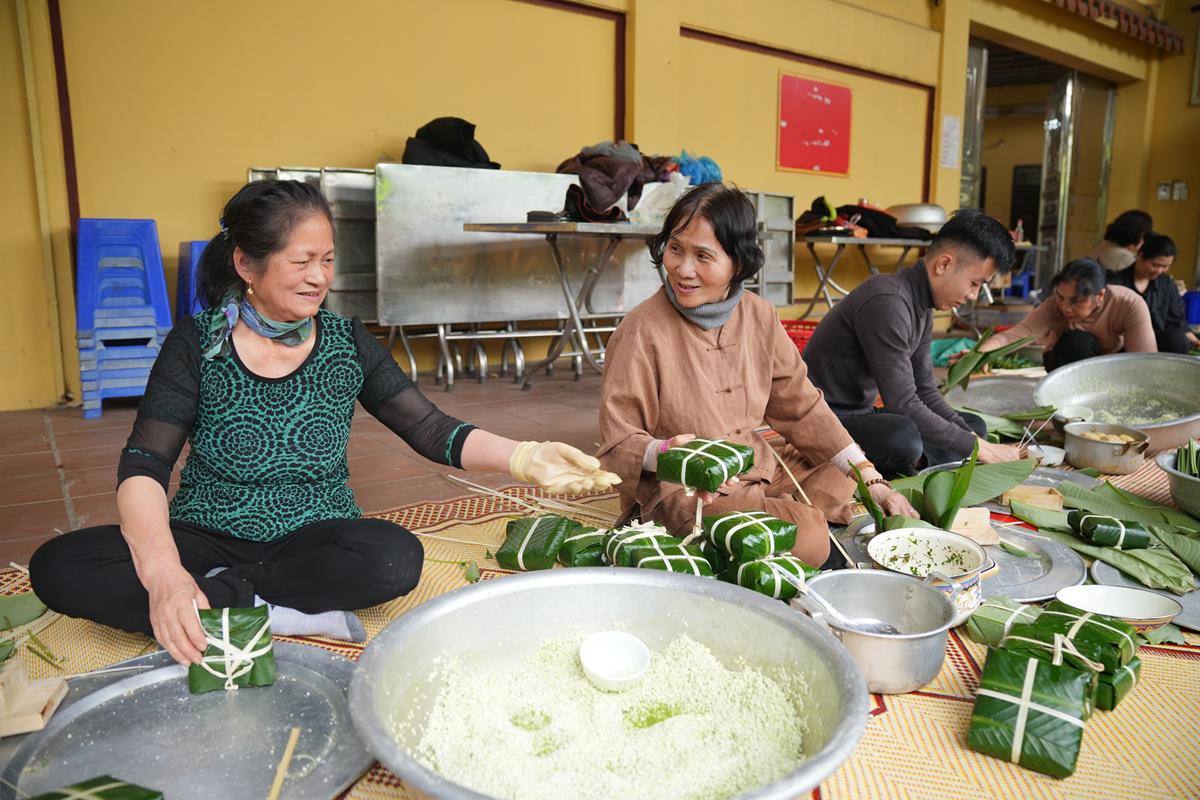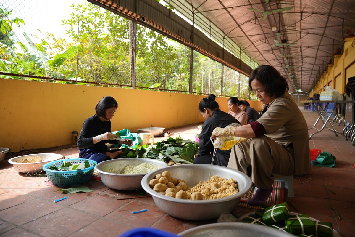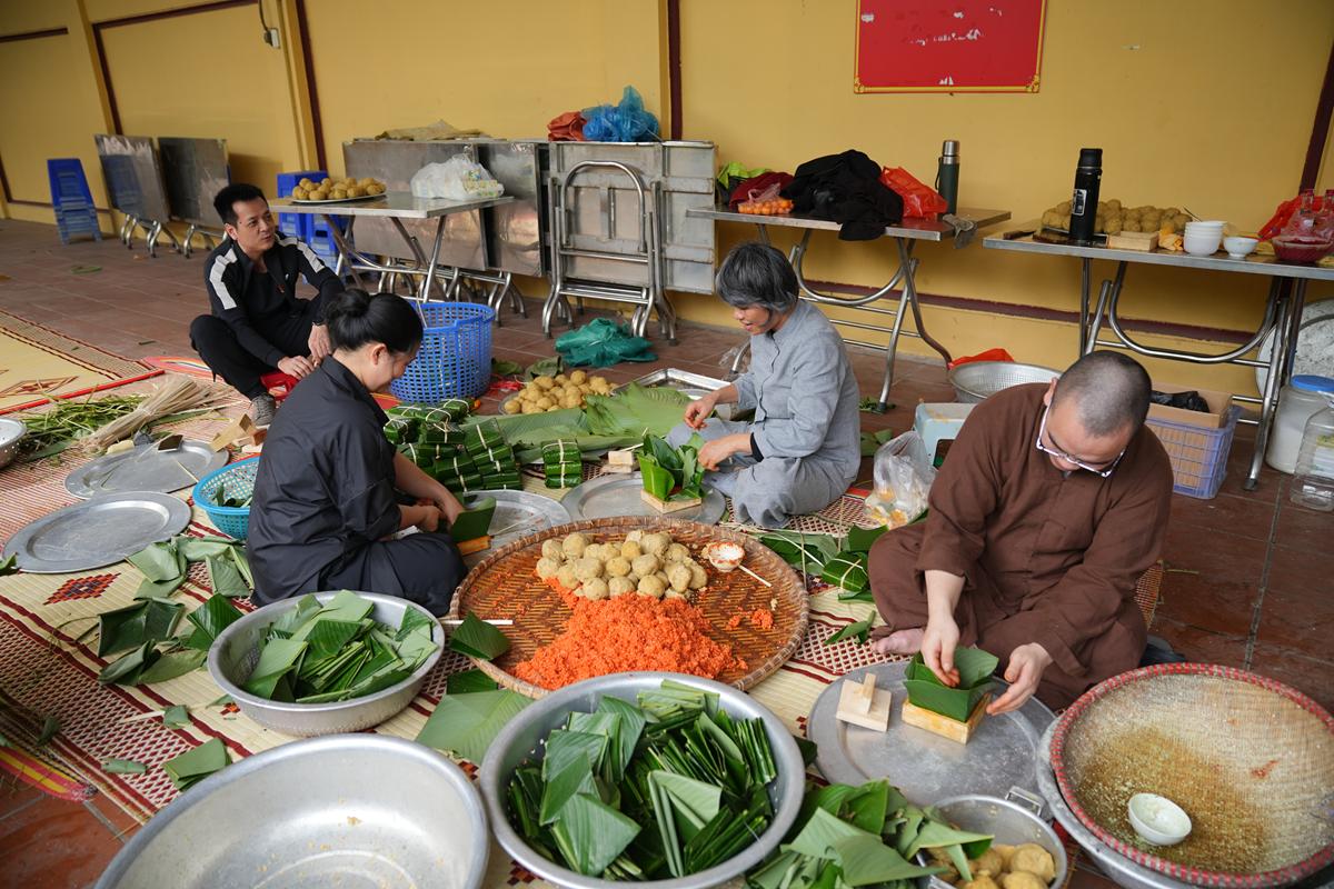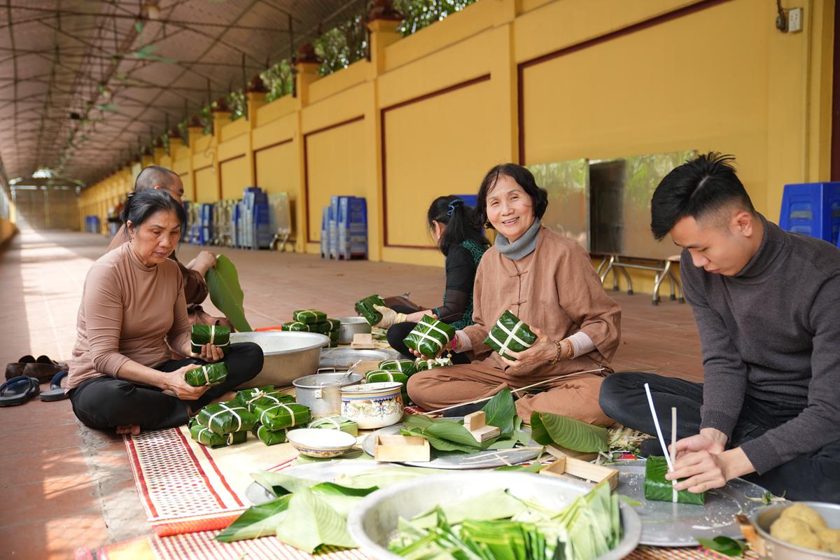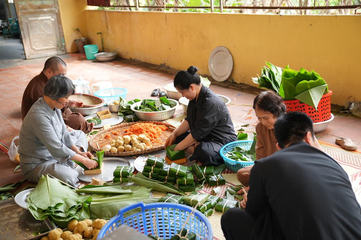 Đặc biệt, nơi góc bếp chùa Bằng, không khí Tết cổ truyền hiện hữu rõ nét và ấm áp hơn bao giờ hết. Bên bếp lửa hồng rực, chư Tăng cùng Phật tử quây quần gói bánh chưng chay, tay thoăn thoắt xếp lá dong, đong gạo nếp, đỗ xanh trong tiếng trò chuyện rì rầm thân ái. Mùi nếp mới quyện cùng hương lá dong, khói bếp lan tỏa trong tiết trời se lạnh cuối năm, gợi lên cảm giác sum vầy, chan chứa nghĩa tình. Những nồi bánh chưng đỏ lửa suốt đêm không chỉ nấu chín bánh Tết, mà còn hun đúc tinh thần lục hòa, sẻ chia và lòng tri ân đối với tổ tiên, nguồn cội.