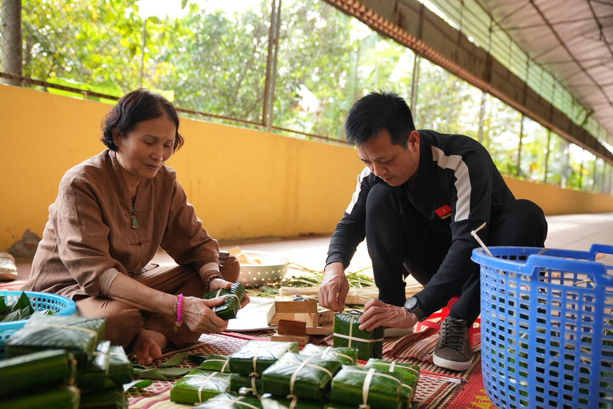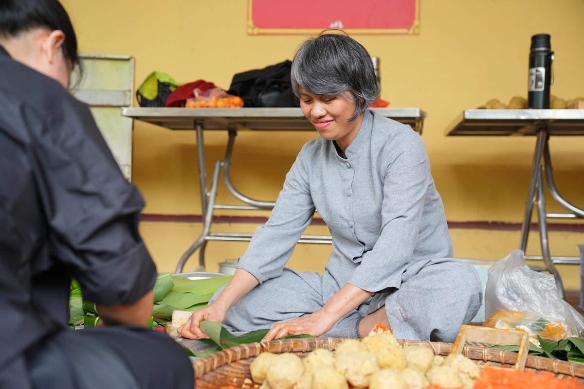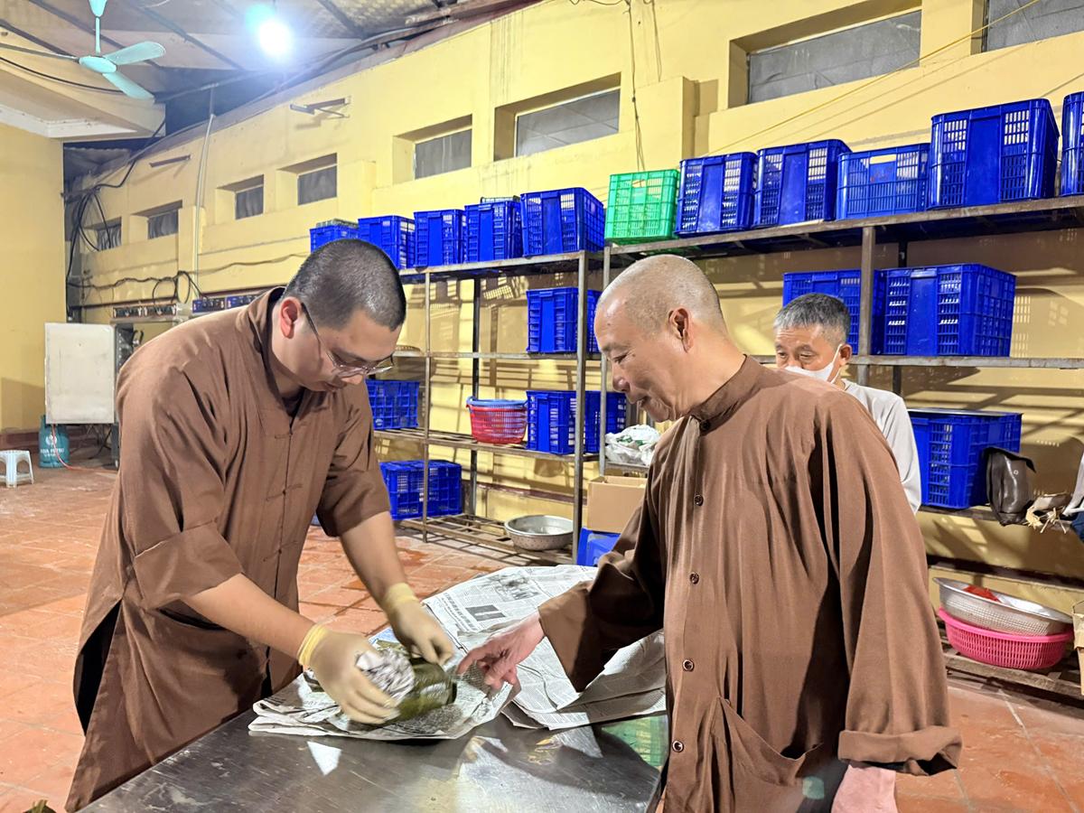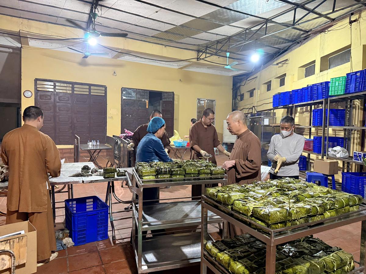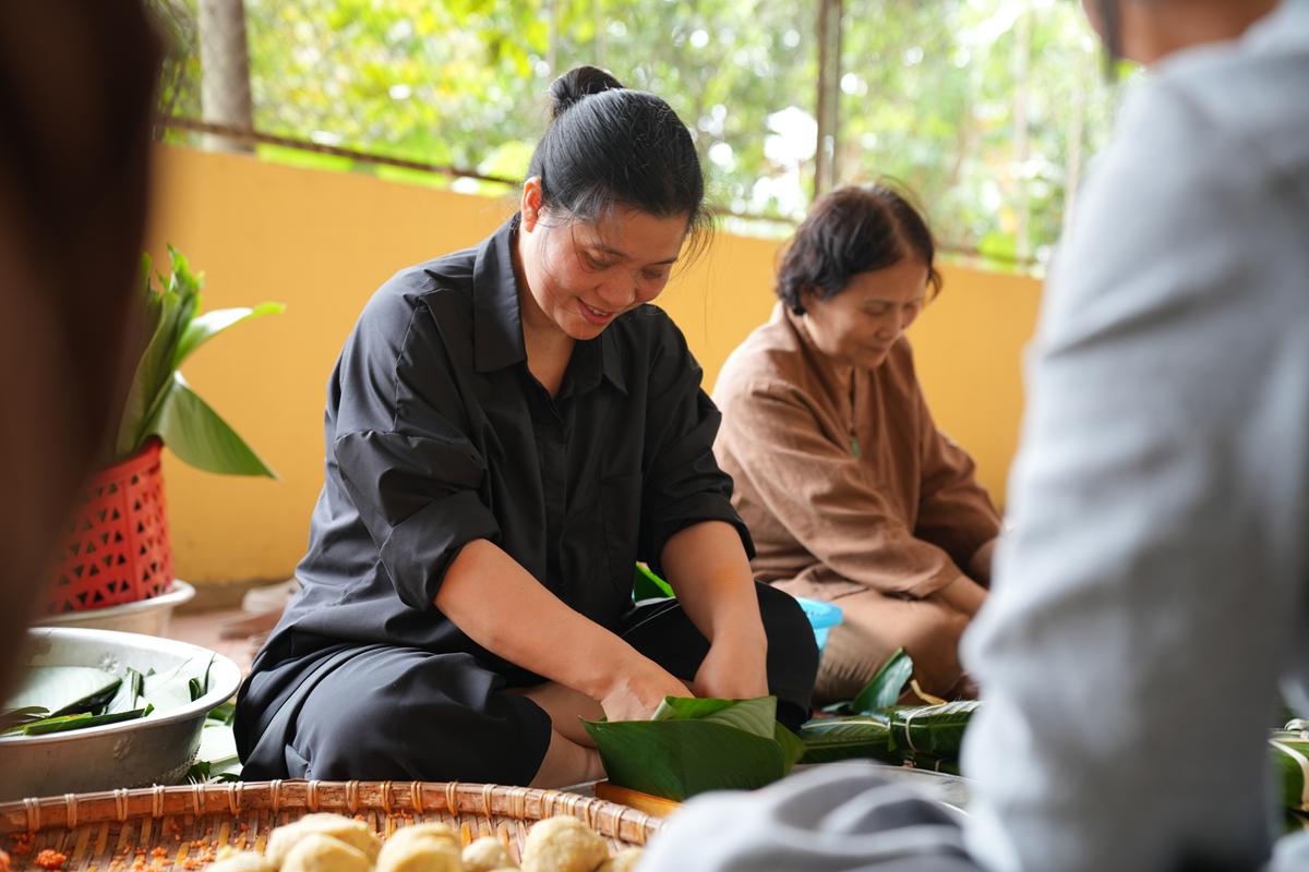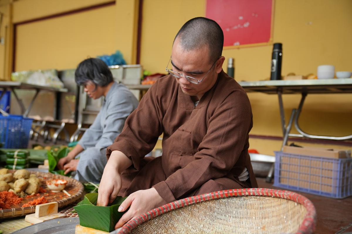 Đặc biệt, nơi góc bếp chùa Bằng, không khí Tết cổ truyền hiện hữu rõ nét và ấm áp hơn bao giờ hết. Bên bếp lửa hồng rực, chư Tăng cùng Phật tử quây quần gói bánh chưng chay, tay thoăn thoắt xếp lá dong, đong gạo nếp, đỗ xanh trong tiếng trò chuyện rì rầm thân ái. Mùi nếp mới quyện cùng hương lá dong, khói bếp lan tỏa trong tiết trời se lạnh cuối năm, gợi lên cảm giác sum vầy, chan chứa nghĩa tình. Những nồi bánh chưng đỏ lửa suốt đêm không chỉ nấu chín bánh Tết, mà còn hun đúc tinh thần lục hòa, sẻ chia và lòng tri ân đối với tổ tiên, nguồn cội.