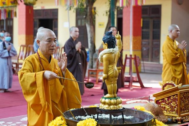 Trong không khí trang nghiêm thanh tịnh, đối trước Phật đài, chư Tôn đức Tăng và đại diện Phật tử bản tự đã làm lễ niêm hương bạch Phật, tụng kinh Phật đản và thực hiện lễ tắm Phật khép lại buổi lễ thành tựu viên mãn.
