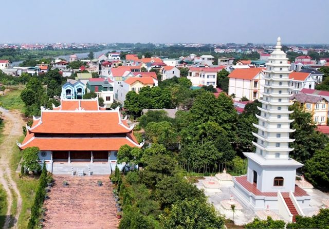 Tòa tiền đường và tam bảo kết nối với nhau tạo thành hình chữ “Đinh”. Tiền đường là gian nhà ba gian hai dĩ, bộ mái gồm các vì kèo làm theo kiểu “chồng rường con nhị”.