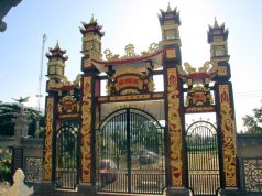 Cửa chính có bề mặt hình chữ nhật, phần dưới mở vòm cửa lớn trông thẳng vào Tiền đường. Tầng trên mở nhiều cửa nhỏ trông ra bốn phía. Hai bên cửa được xây giống nhau trên trổ những cửa tròn “sắc – không” theo giáo lý đạo Phật.