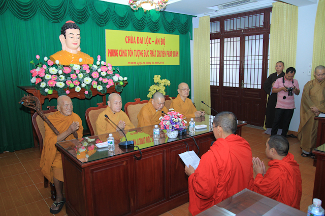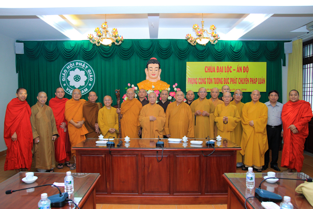 Nhân dịp thăm hỏi và vấn an Chư tôn đức giáo phẩm lãnh đạo Giáo hội, phái đoàn còn cúng dường Tôn tượng Phật Chuyển Pháp Luân được tạc theo mẫu cổ trong viện Bảo tàng Ấn Độ.