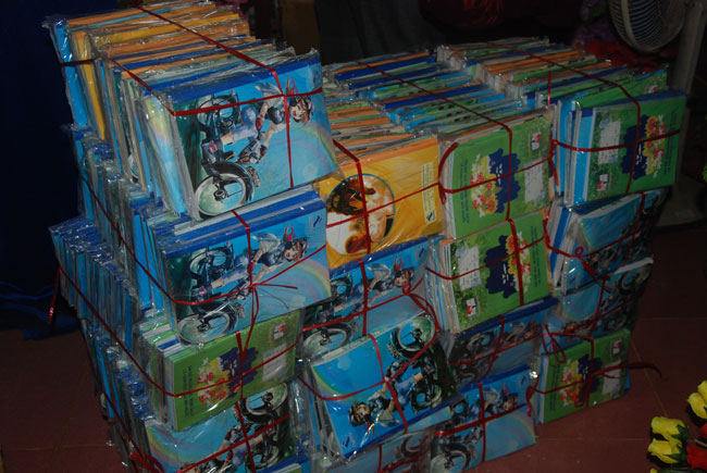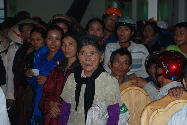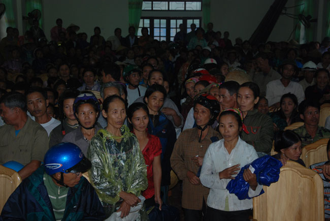 Đoàn tới nơi khoảng 2h chiều cùng ngày, trời vẫn mưa và càng lúc càng nặng hạt, người dân tập trung về Ủy ban xã để chờ đợi được phát quà.
