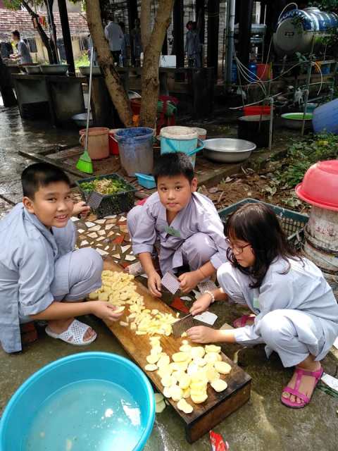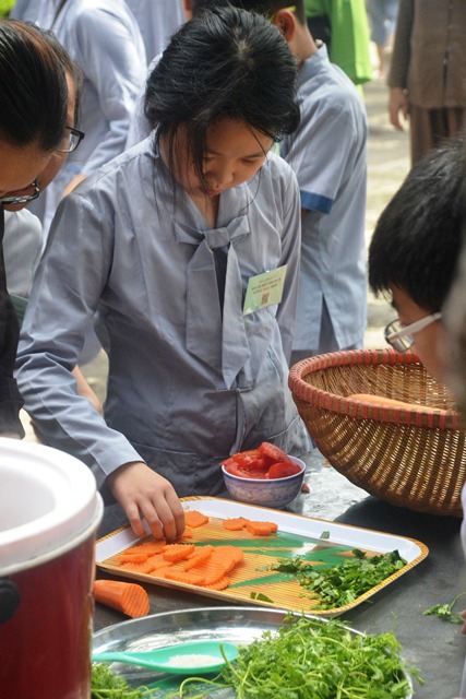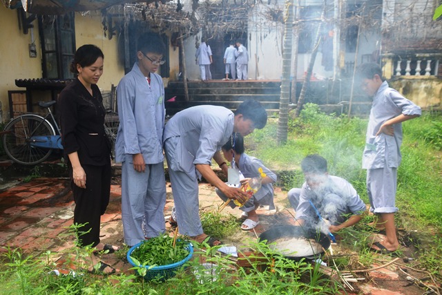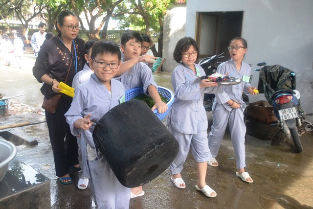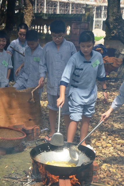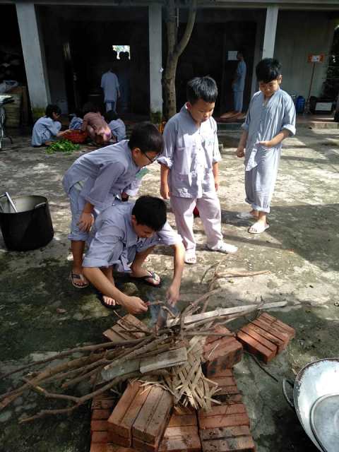 Sau đó các em được thực tập Kỹ năng tự nấu một bữa cơm bếp củi theo gia đình. Tay áo xắn thật cao, cầm dao thái còn ngượng nghịu, tự nhóm bếp củi khói cay xè …
