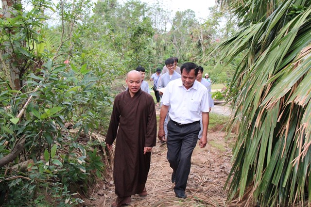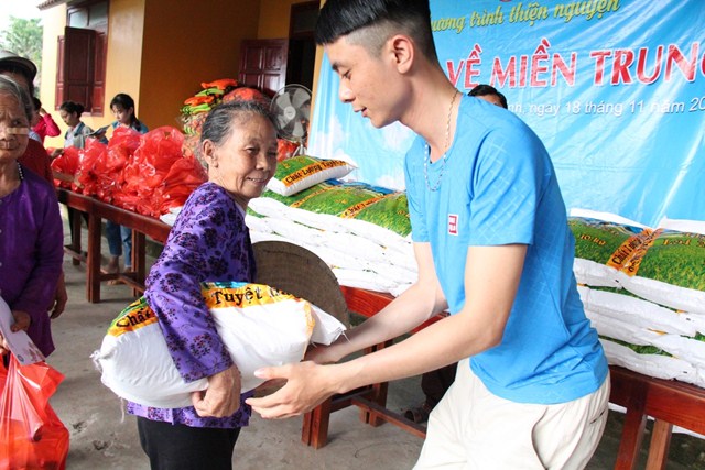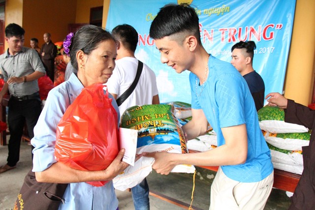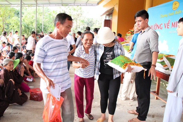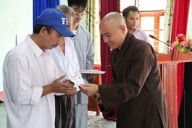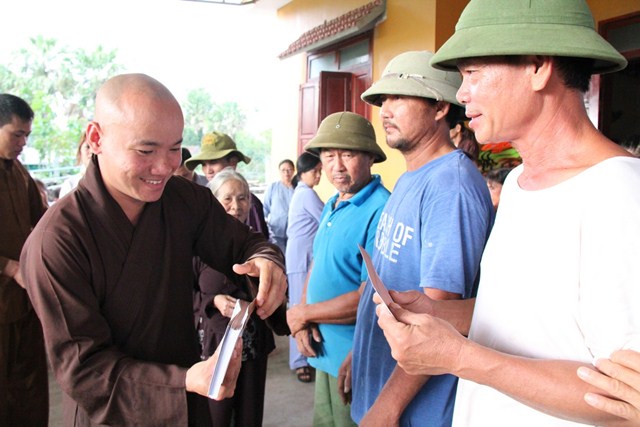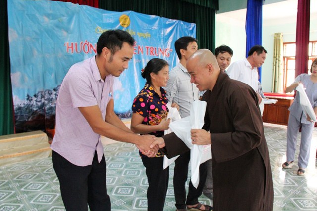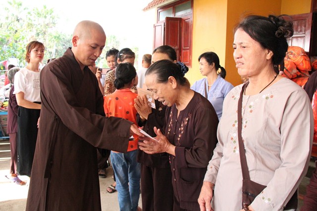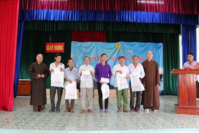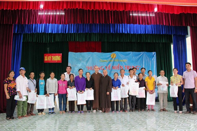 Nhờ sự kết duyên của Đại đức Thích Tâm Nguyện và Phật tử Chùa Giai Lam (Hà Tĩnh), đoàn thiện nguyện Chùa Hòa Phúc đã tới UBND xã Kỳ Thượng để gặp gỡ và trợ duyên cho 15 hộ dân của 2 xã Kỳ Thượng, Kỳ Sơn bị thiệt hại nặng, mất mát nhiều hoa màu, tài sản, nhà cửa trong cơn bão vừa qua, mỗi gia đình được đoàn hỗ trợ 10.000.000 VNĐ cùng quà pháp bảo nhằm giúp bà con nhân dân có kinh phí khắc phục hậu quả của cơn bão, sớm ổn định lại cuộc sống. Tại đây, đoàn đã đến thăm và động viên trao tặng quà cho cụ Thuể, một cụ già neo đơn trong xã, có hoàn cảnh khó khăn, căn nhà nhỏ của cụ đã bị cơn bão phá hỏng nặng nề.