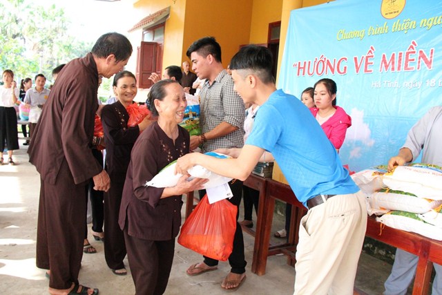 Ngoài ra, tại xã Thạch Tân đoàn đã trao tặng 250 chiếc áo phao cứu hộ cho Ban chỉ huy quân sự – phòng chống bão lũ; 160 chiếc khăn len cho Hội người cao tuổi; Hàng trăm bộ quần áo mới, đồ chơi trẻ em cho Làng trẻ SOS và trường mầm non xã Thạch Tân. Tổng số tịnh tài, tịnh vật đoàn đã trao tặng tại tỉnh Hà Tĩnh là 250.000.000 VNĐ.