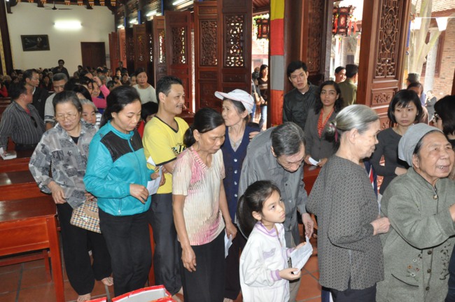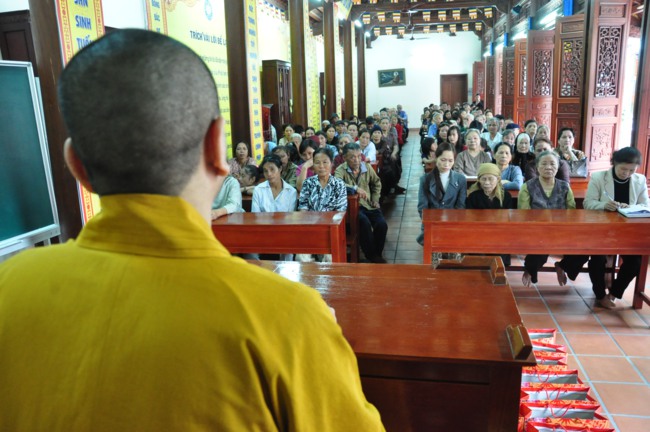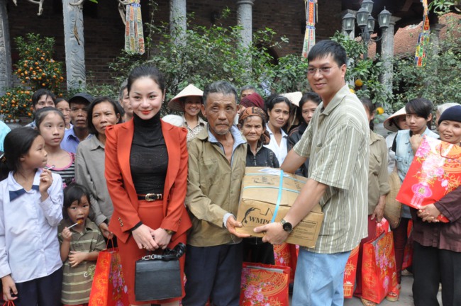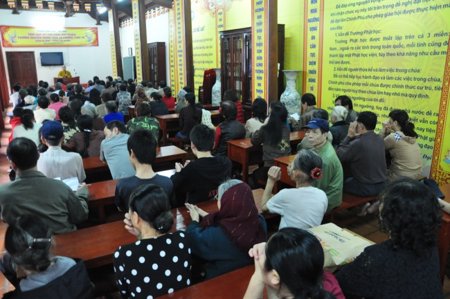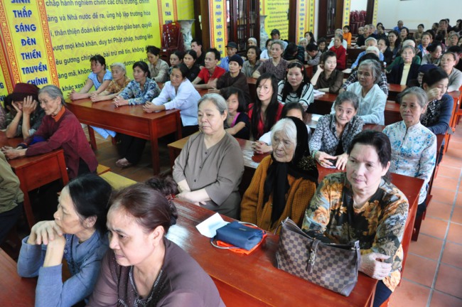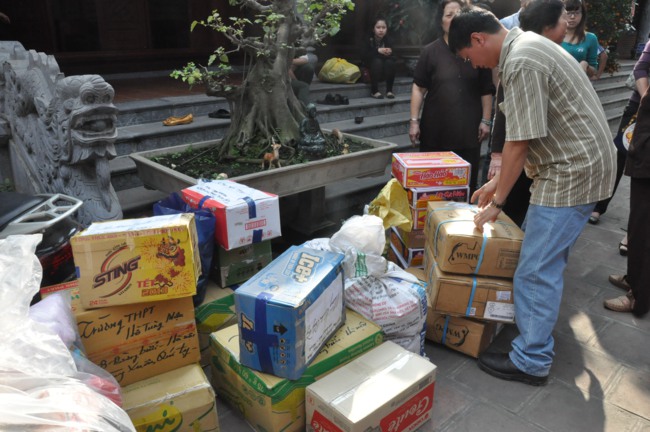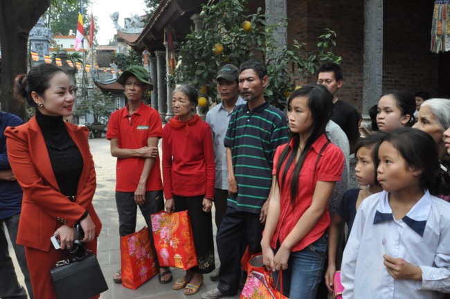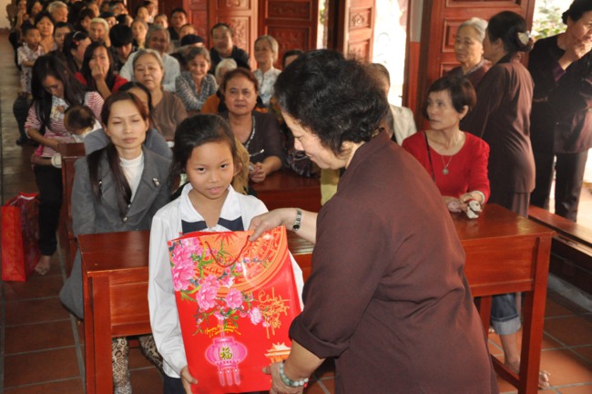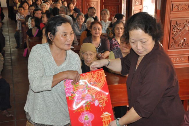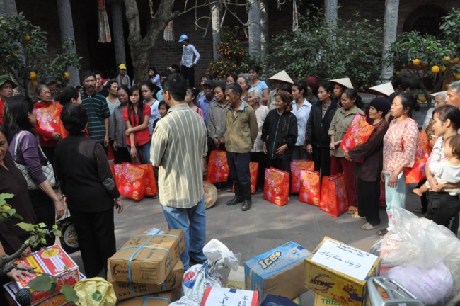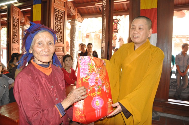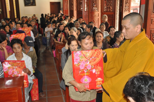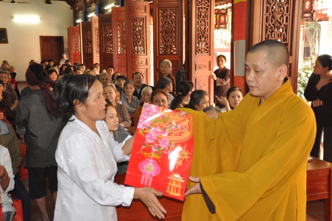 Buổi chiều, chư Tăng và Phật tử bản tự đã trao tặng 250 phần quà cho những người nghèo, có hoàn cảnh khó khăn trong xóm chài ở ven sông Hồng. Những người nghèo nơi đây, có những hoàn cảnh khác nhau. Có người nhà đông con, không có nơi ở, phải sống ở trên chiếc bè trôi trên sông, có người bị thương tật 80/100, có người nhặt phế liệu sống qua ngày, và có người thậm chí một mùa đông chỉ có đúng 1 chiếc áo sơ mi cũ nát,…Họ đều là những con người lam lũ, chưa bao giờ có một cái Tết ấm no, đủ đầy. Nhưng trong những năm gần đây, thật may mắn khi Tổ đình Hồng Phúc cứ gần Tết lại tổ chức chương trình phát quà tặng cho những con người nghèo khó đó…Họ tuy nghèo lắm, nhưng họ đã thấy thật sự ấm áp, bởi những món quà đong đầy tình yêu thương của con người với con người. Chỉ là chiếc bánh trưng chay, chút tịnh tài, thùng mỳ, nước uống…nhưng với những người dân nghèo, đó đã là niềm hạnh phúc lớn lao nhất. Họ đã có thêm niềm tin sâu dày vào Phật pháp, và họ, sẽ càng có thêm niềm tin hơn vào cuộc sống này, khi họ đã hiểu được thế nào là ý nghĩa của cuộc sống và “Hạnh Nhẫn Nhịn” qua lời chia sẻ của Đại đức trụ trì Thích Tâm Hoan.