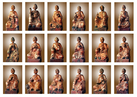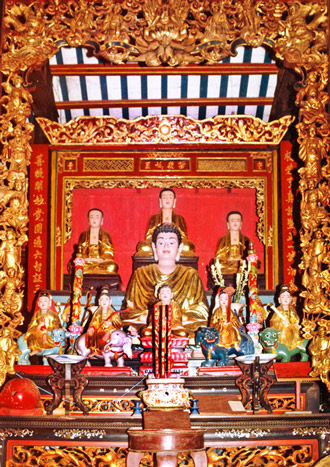 Ở chính điện, hầu hết tượng các vị Phật, Bồ-tát … đều được tạc bằng gỗ, sơn son thếp vàng. Đặc biệt, bộ tượng thập bát La-hán, mỗi tượng cao khoảng 0,86m, được nhóm thợ nổi tiếng ở địa phương tạc vào những năm cuối thế kỷ XIX, đầu thế kỷ XX. Ba tấm bao lam chạm khắc tứ linh, tứ quý, cửu long và thập bát La-hán có giá trị nghệ thuật cao.