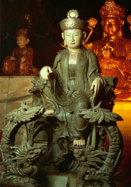 Tượng Bà Chúa Ba ở giữa. Phía trước là tượng người chị cả Diệu Thanh cưỡi sư tử xanh (tức: đã trở thành Bồ Tát Văn Thù) và tượng người chị thứ hai Diệu Âm cưỡi voi trắng (tức: đã trở thành Bồ Tát Phổ Hiền). Phía sau là tượng vua cha và hoàng hậu mẹ của Bà Chúa Ba.