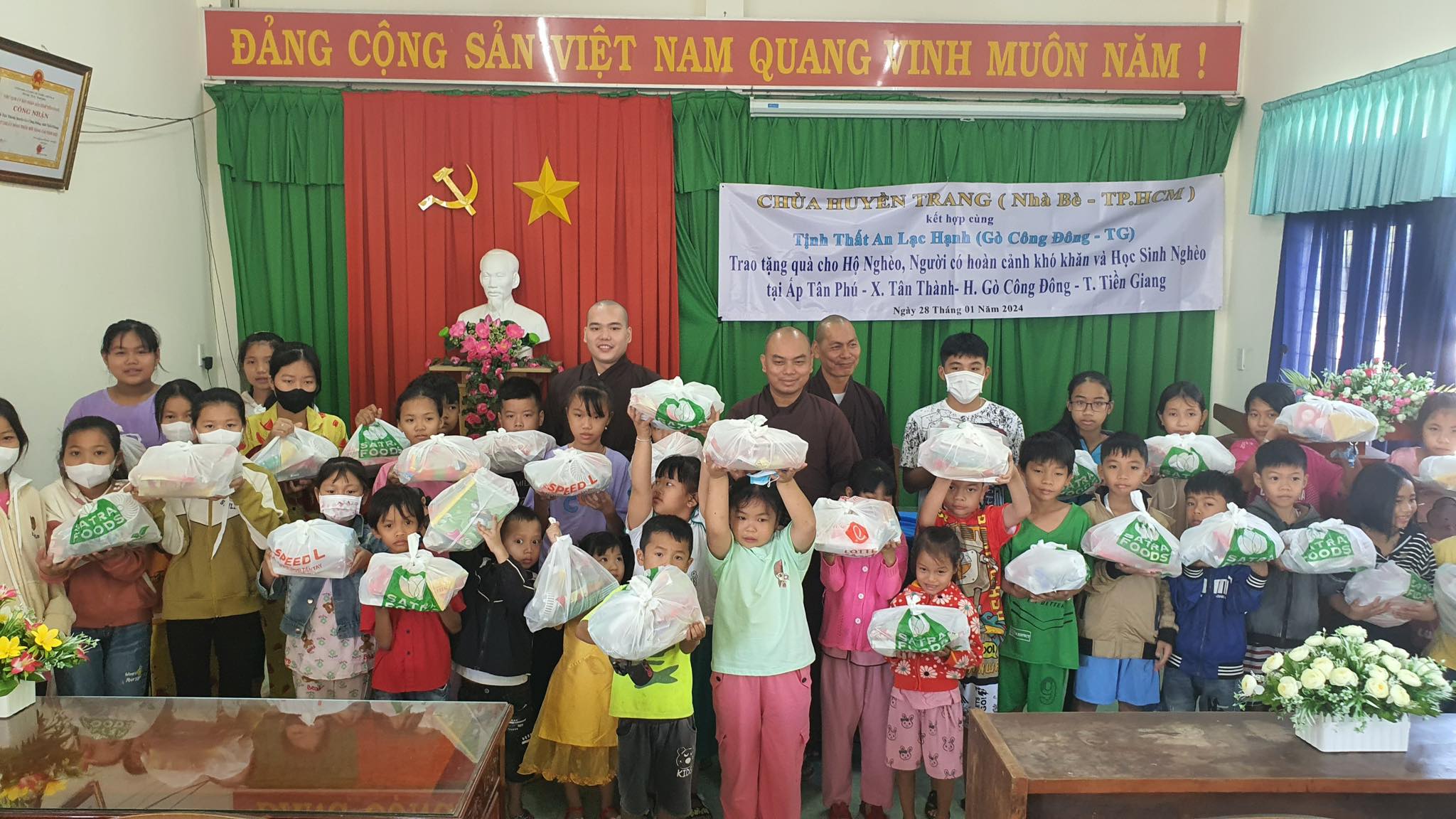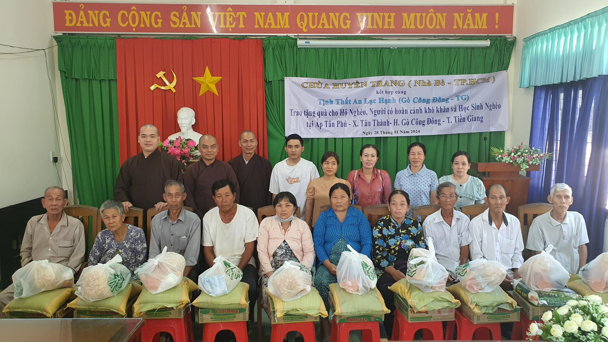 Ngày 28-1-2024( nhằm 18-12 AL), chùa Huyền Trang ( H.Nhà Bè – TP. HCM ) kết hợp cùng Tịnh Thất An Lạc Hạnh (H.Gò Công Đông Tiền Giang ) trao tặng 100 phần quà cho Hộ nghèo và người có hoàn cảnh khó khăn và 50 phần quà cho Trẻ em và Học sinh nghèo tại Ấp Tân Phú – xã Tân Thành – H.Gò Công Đông – T. Tiền Giang.