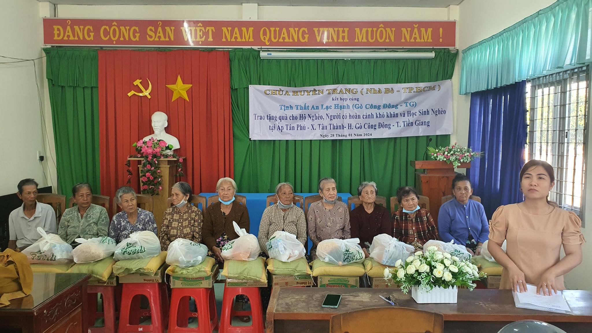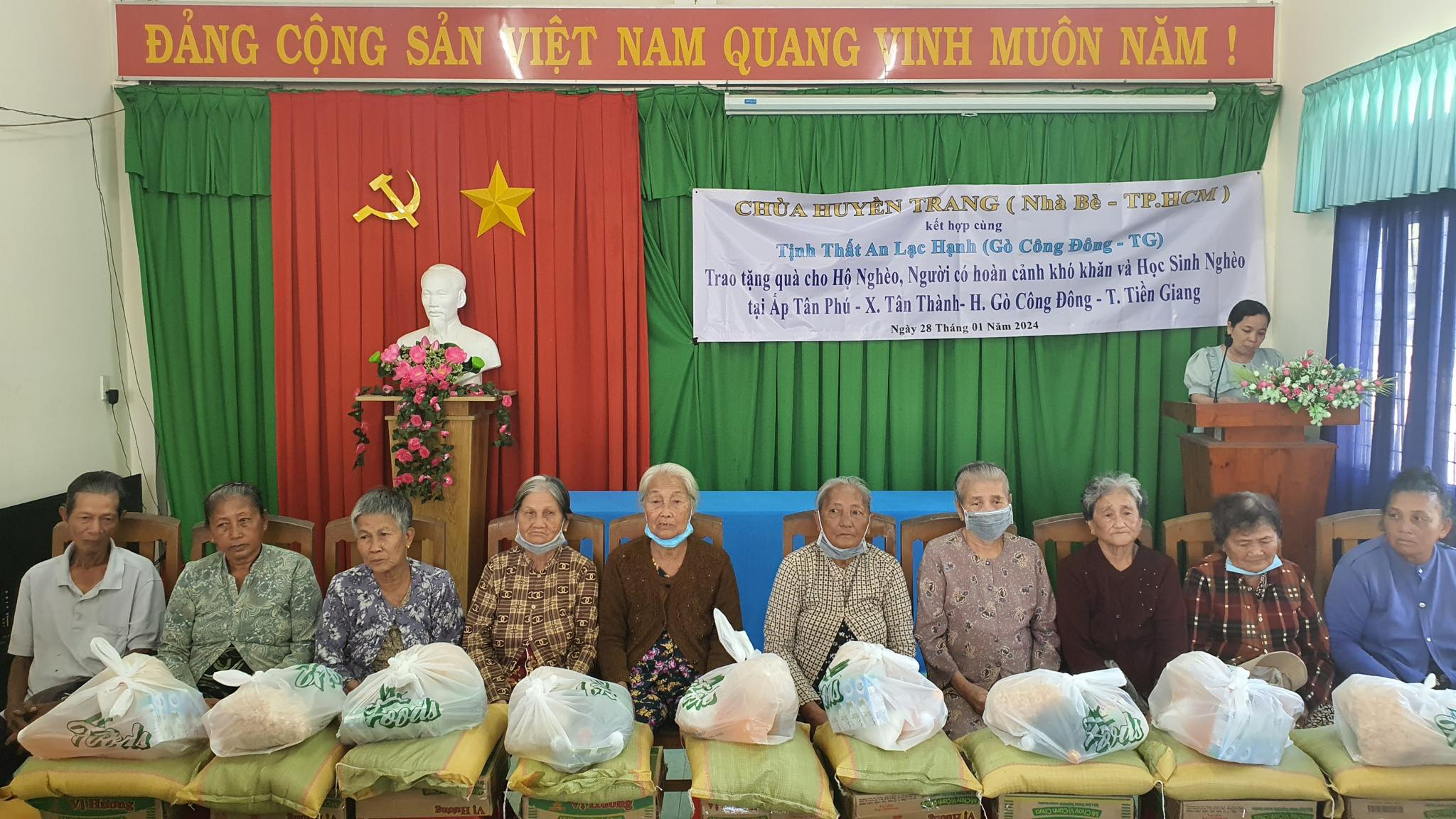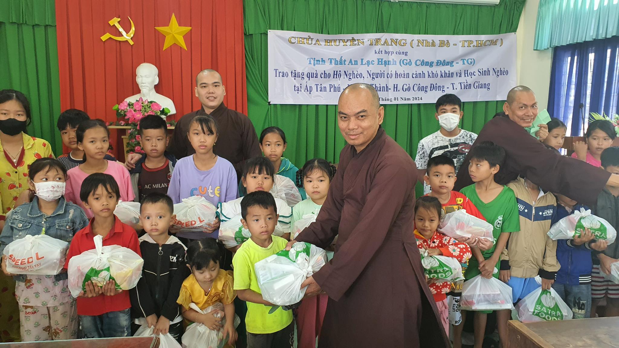 Ngày 28-1-2024( nhằm 18-12 AL), chùa Huyền Trang ( H.Nhà Bè – TP. HCM ) kết hợp cùng Tịnh Thất An Lạc Hạnh (H.Gò Công Đông Tiền Giang ) trao tặng 100 phần quà cho Hộ nghèo và người có hoàn cảnh khó khăn và 50 phần quà cho Trẻ em và Học sinh nghèo tại Ấp Tân Phú – xã Tân Thành – H.Gò Công Đông – T. Tiền Giang.