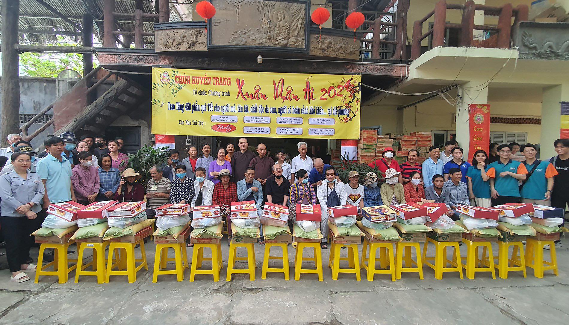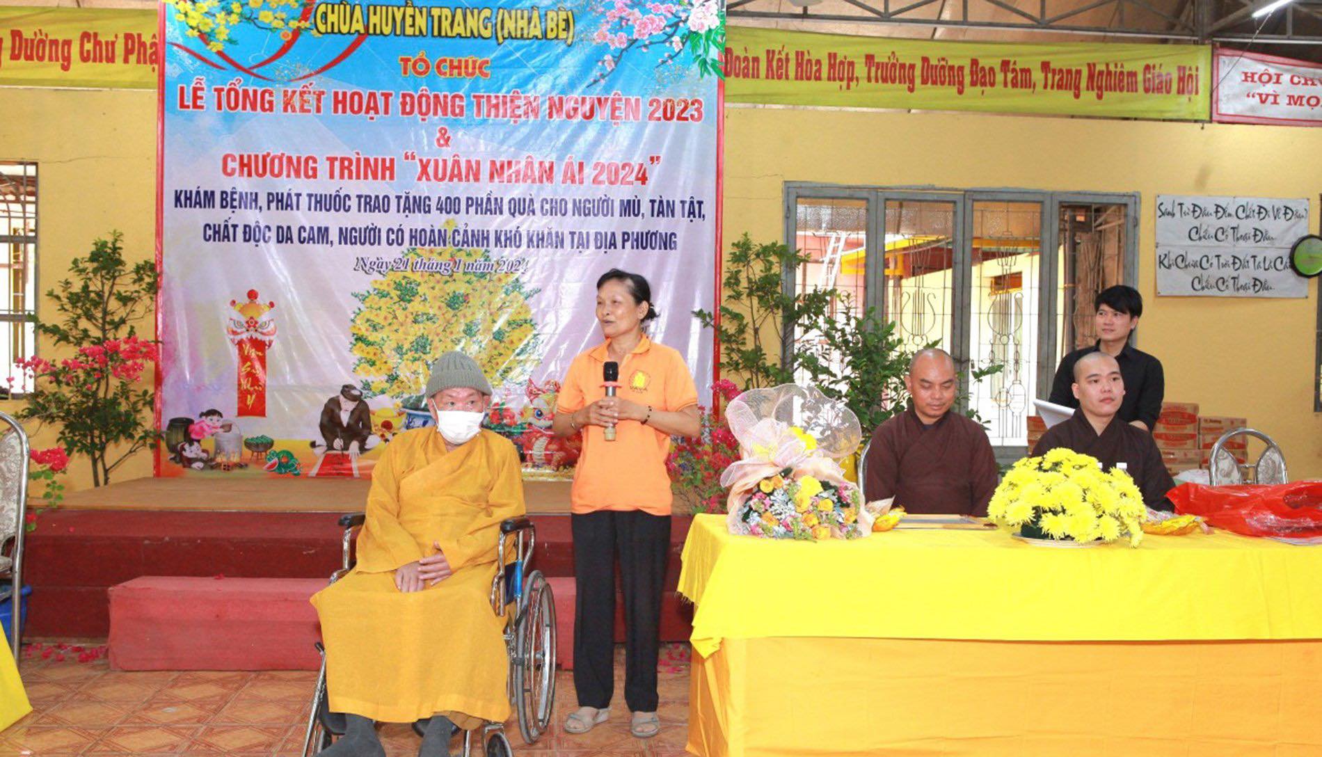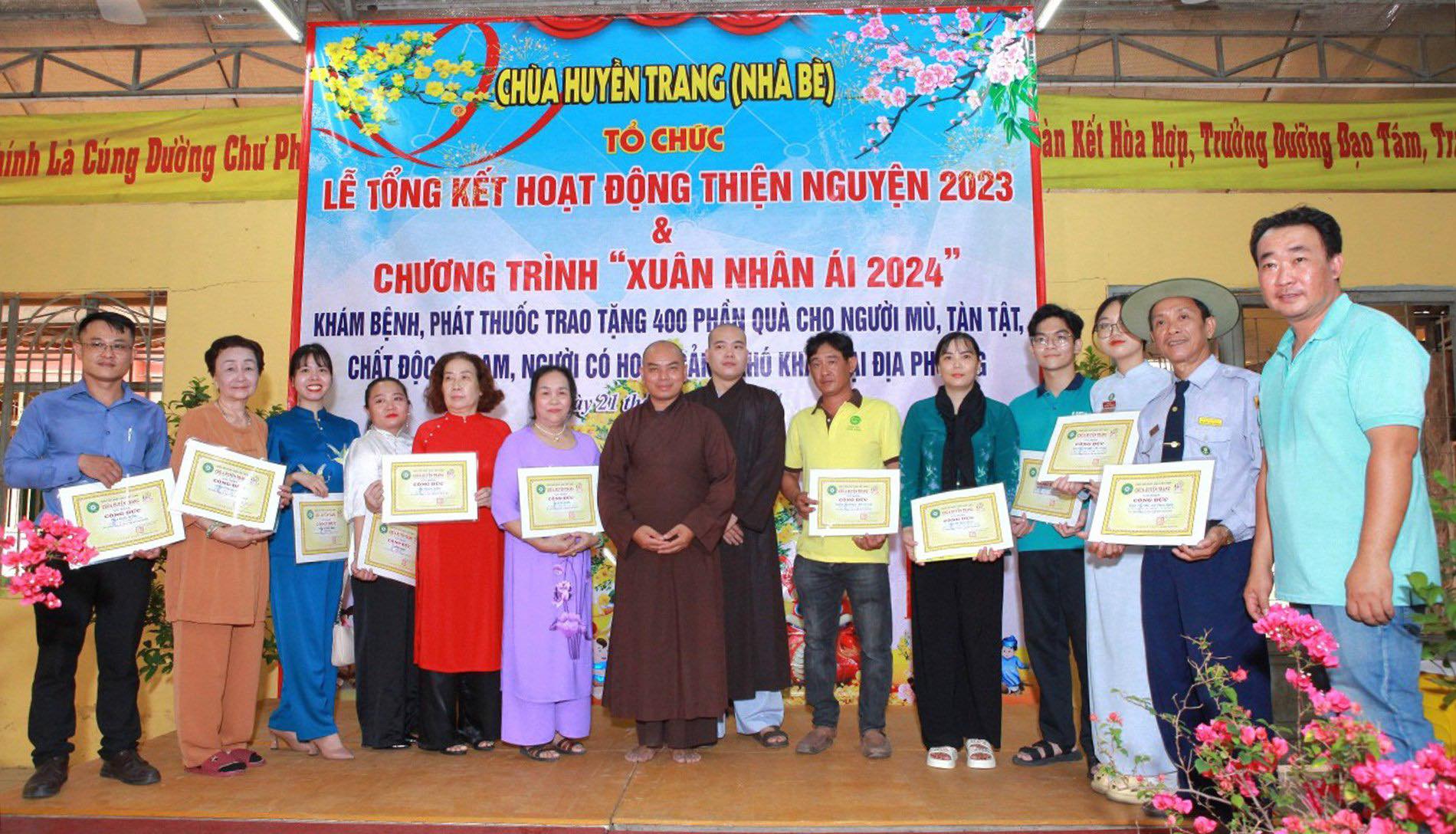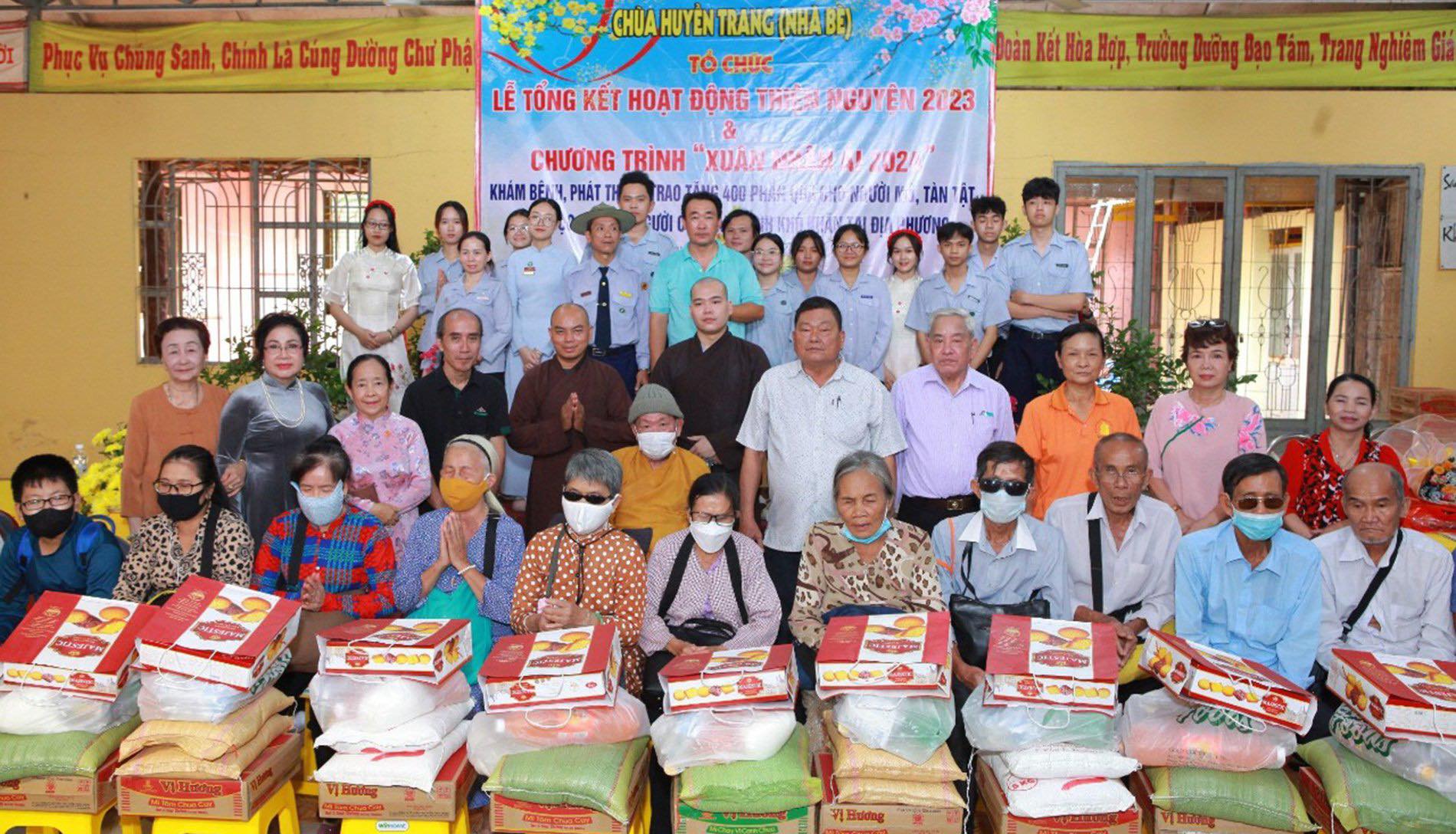 Ngày 21/ 01 / 2024 chùa Huyền Trang (Nhà Bè) tổ chức lễ tổng kết hoạt động thiện nguyện năm 2023 và chương trình “Xuân Nhân Ái 2024 ” khám bệnh phát thuốc và trao tặng 450 phần quà cho người mù, tàn tật , chất độc da cam, người có hoàn cảnh khó khăn… tại địa phương.