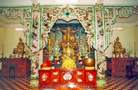 Chính điện gồm năm gian thờ 6 vị Phật và Bồ tát (bằng đồng). Gian giữa tôn trí tượng đức Phật Thích Ca (tượng cao 1,8m). Trước tượng Phật Thích Ca đặt tháp ngọc Xá lợi Phật được tôn thờ vào ngày 18-4-2001 (25-3 năm Tân Tỵ), tượng đức Phật A Di Đà. Hai bên tôn trí tượng bốn vị Bồ tát Quan Âm, Thế Chí, Văn Thù và Phổ Hiền.